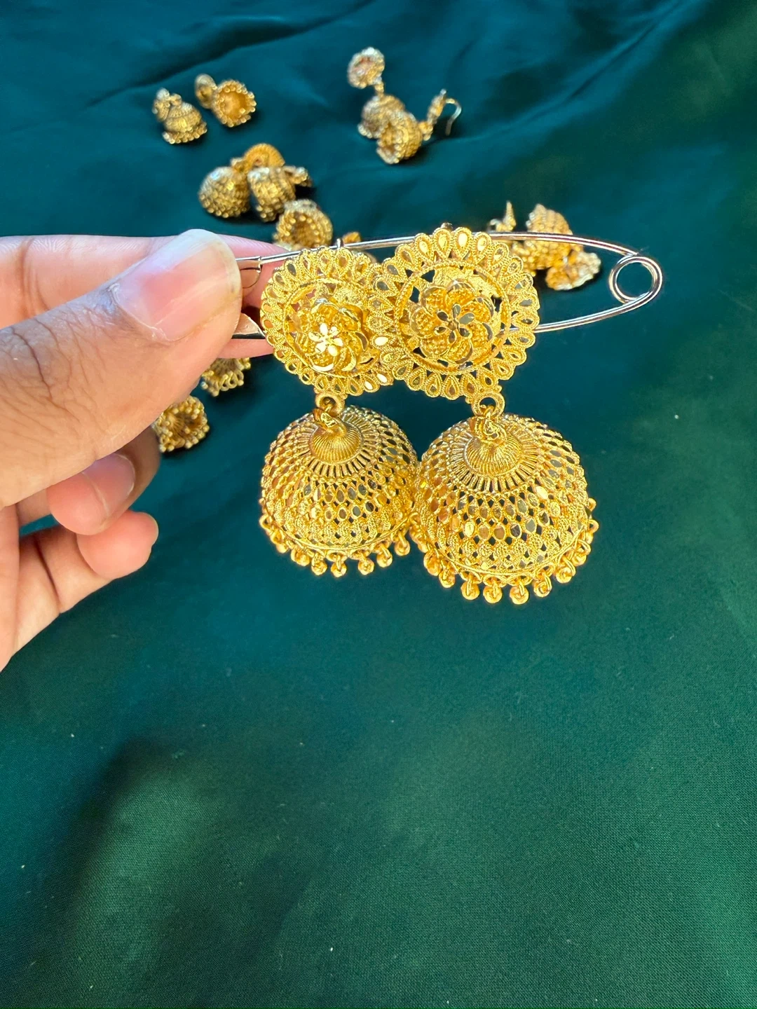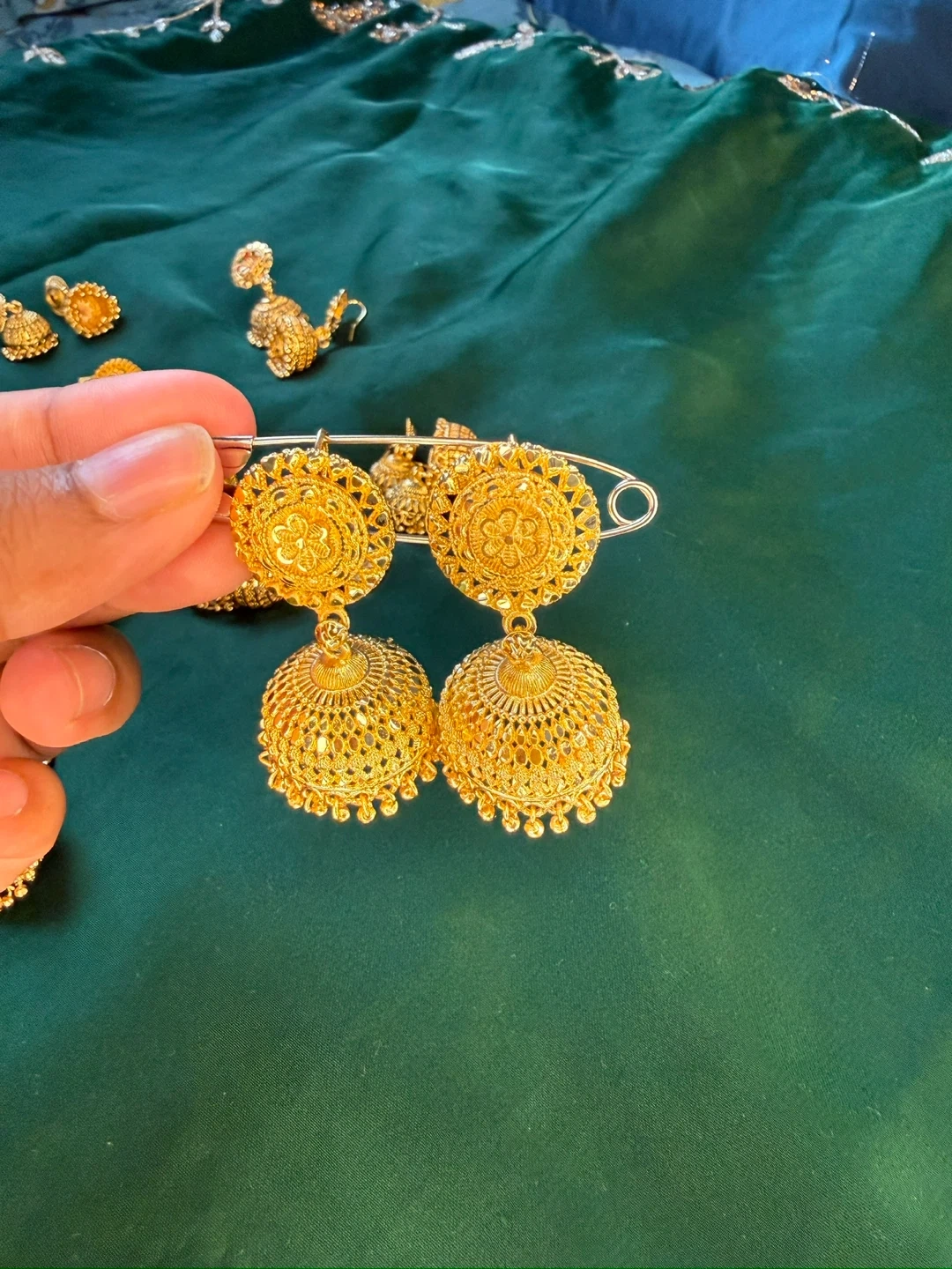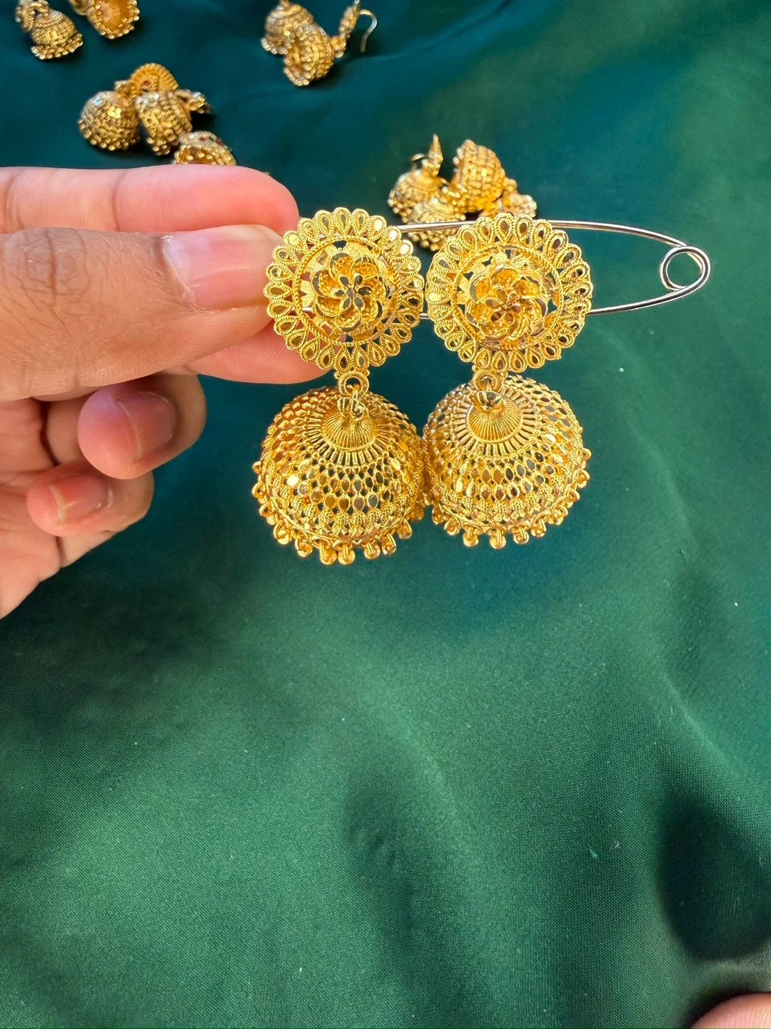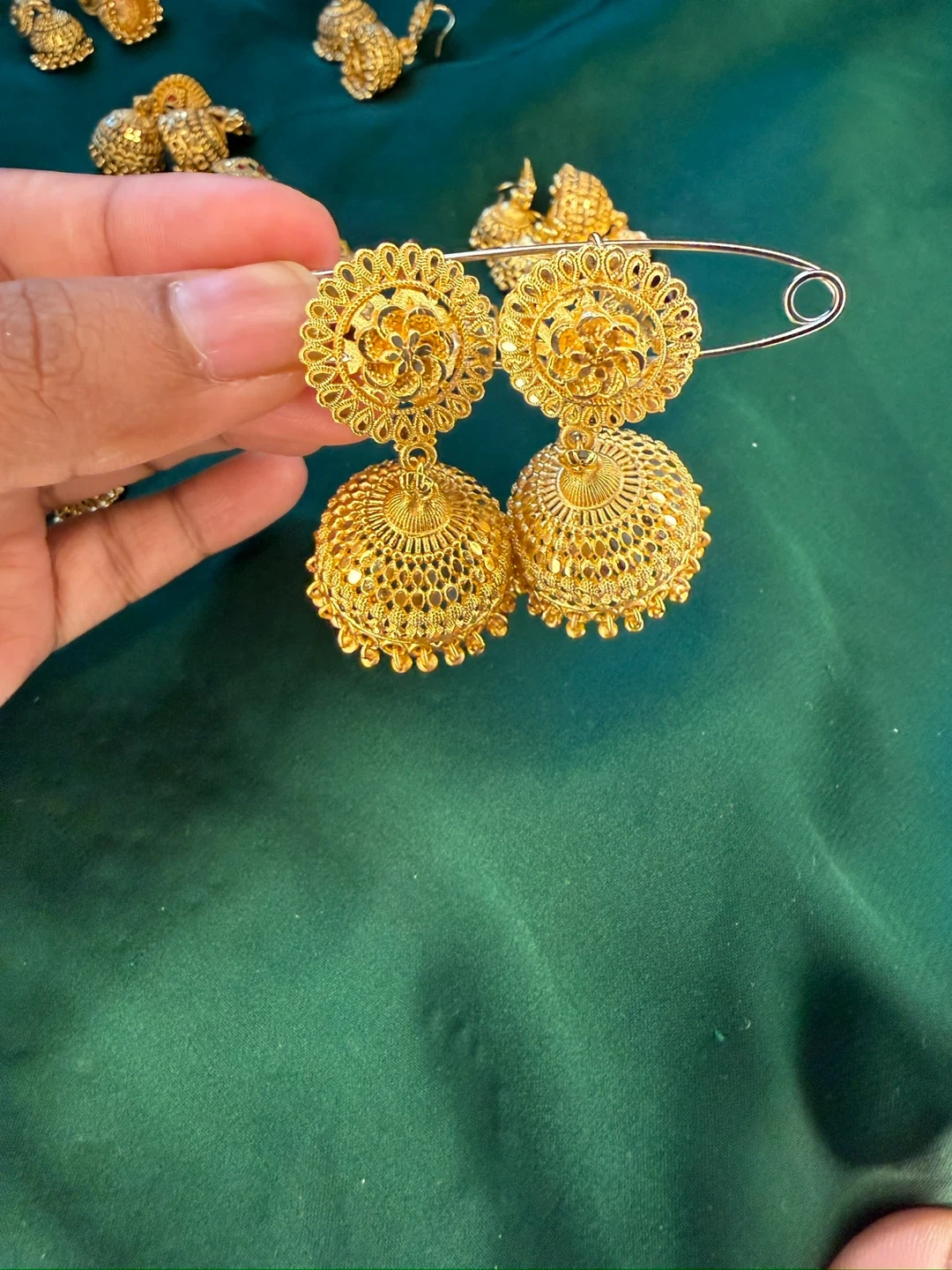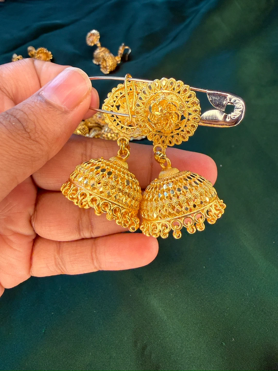 Beautiful gold-tone jhumka earrings. These statement earrings feature intricate filigree work and dangling bell-shaped drops. Perfect for adding a touch of elegance to any outfit!