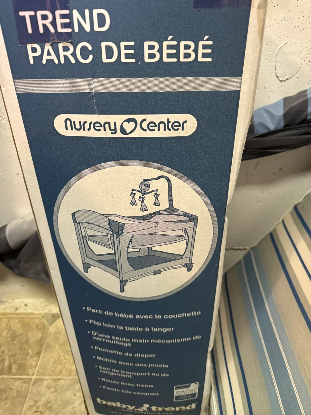 This Baby Trend Nursery Center playard features a bassinet and changer. It has a one-hand locking mechanism and includes a mobile with toys. It also comes with a diaper pouch, toy bag, and wheels with brakes for easy transport. It's compact and easy to fold!