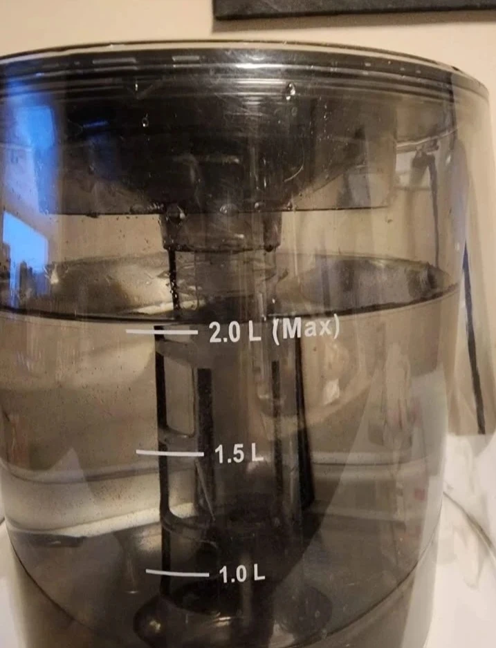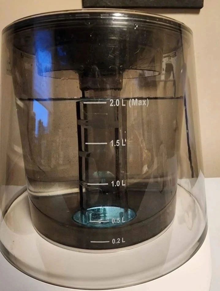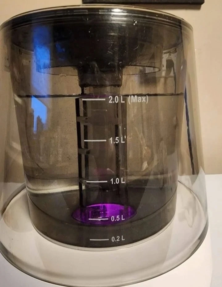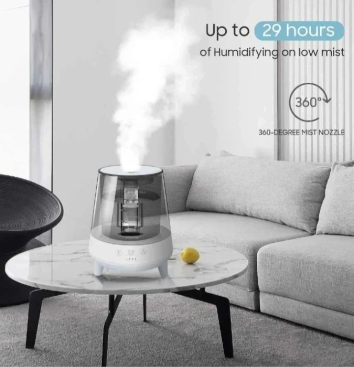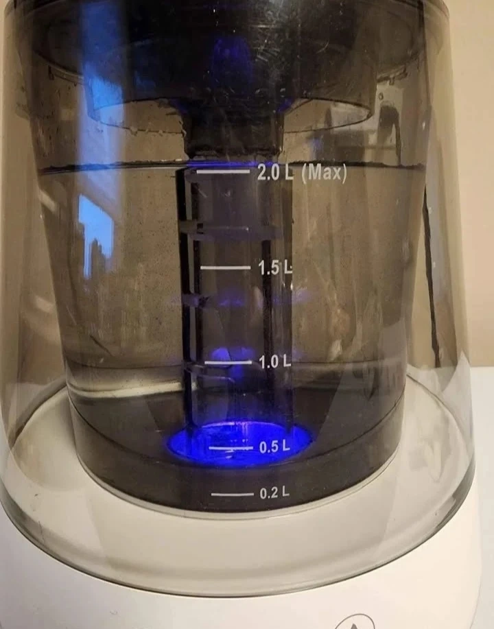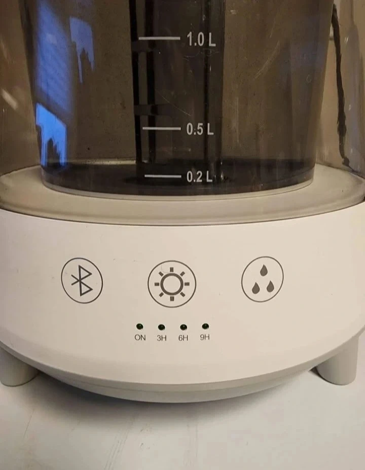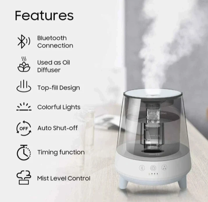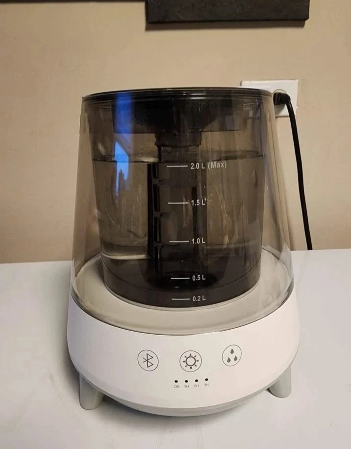 This humidifier has a 2.0-liter capacity. It features adjustable mist settings and timer options. The unit also has Bluetooth connectivity and a color changing LED light. Play music while you relax.....