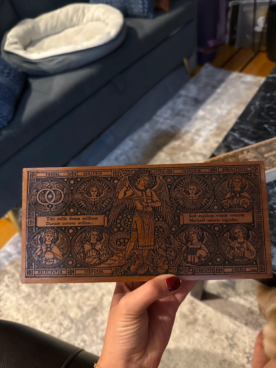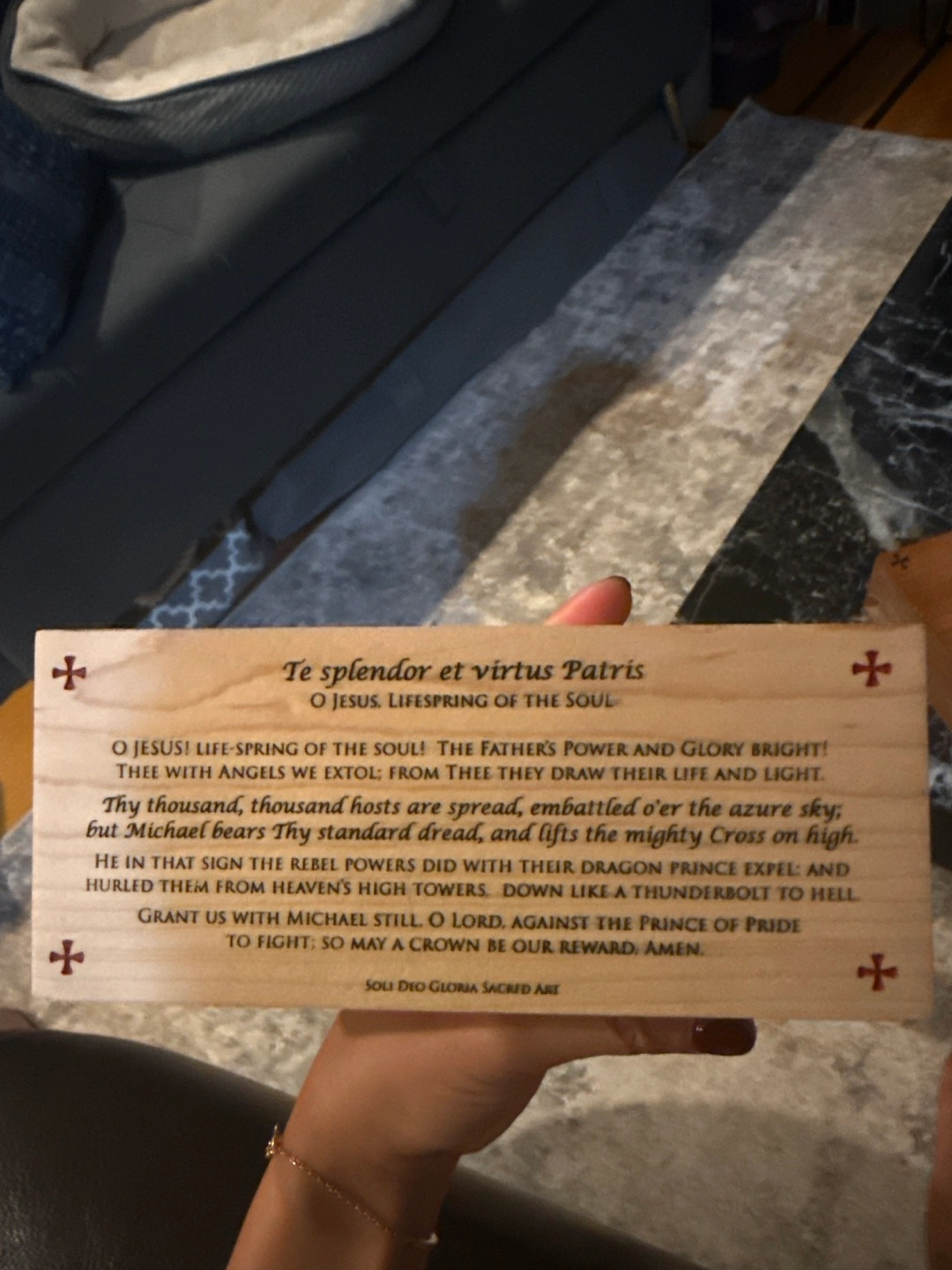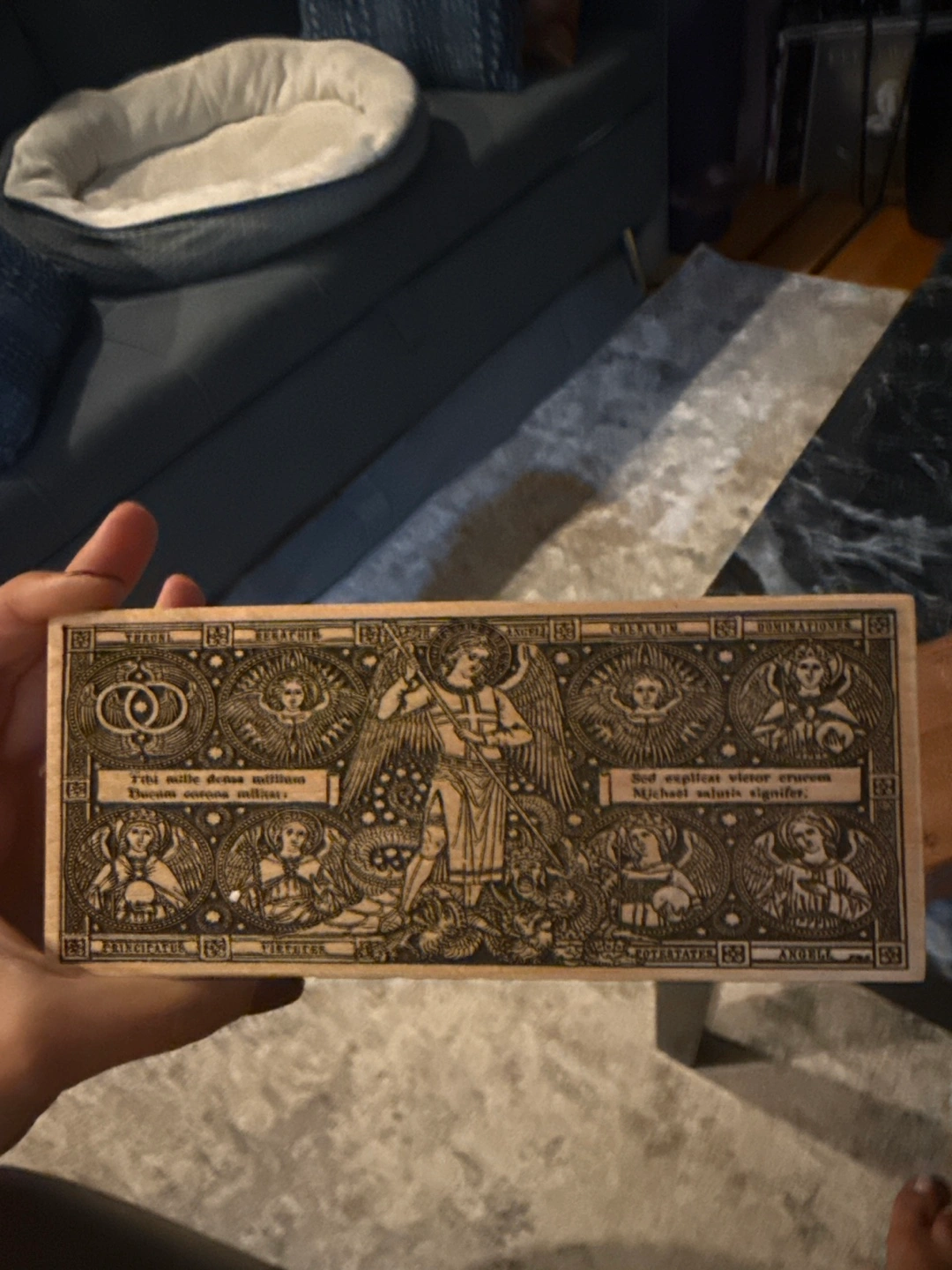 2 Wooden plaque with beautiful religious art. It features depictions of angels and Latin text. The plaque is from SOLI DEO GLORIA Sacred Art.