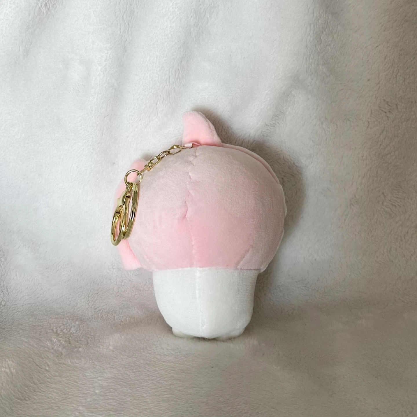 Selling a super cute plush keychain featuring a character in a pink hooded outfit. This soft toy has a gold keychain attached, perfect for bags or backpacks. It's a charming little accessory!