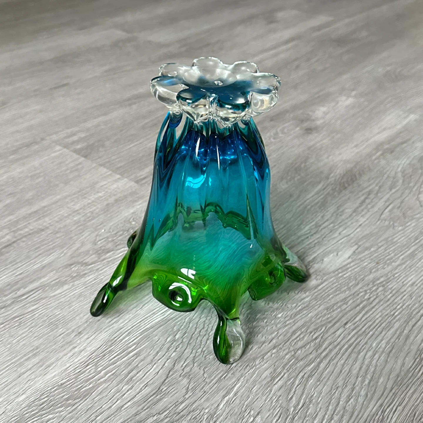 This is a beautiful hand-blown glass vase featuring a stunning swirl of blue and green colours. Its unique, artistic shape makes it a lovely accent piece for any room. Glass material.