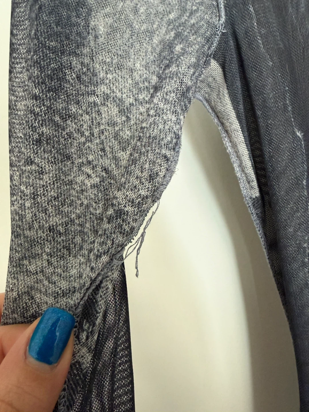 Grey patchwork print sheer mock neck dress. Long sleeves with a slim fit. Lining underneath. There's a small snag on the seam.