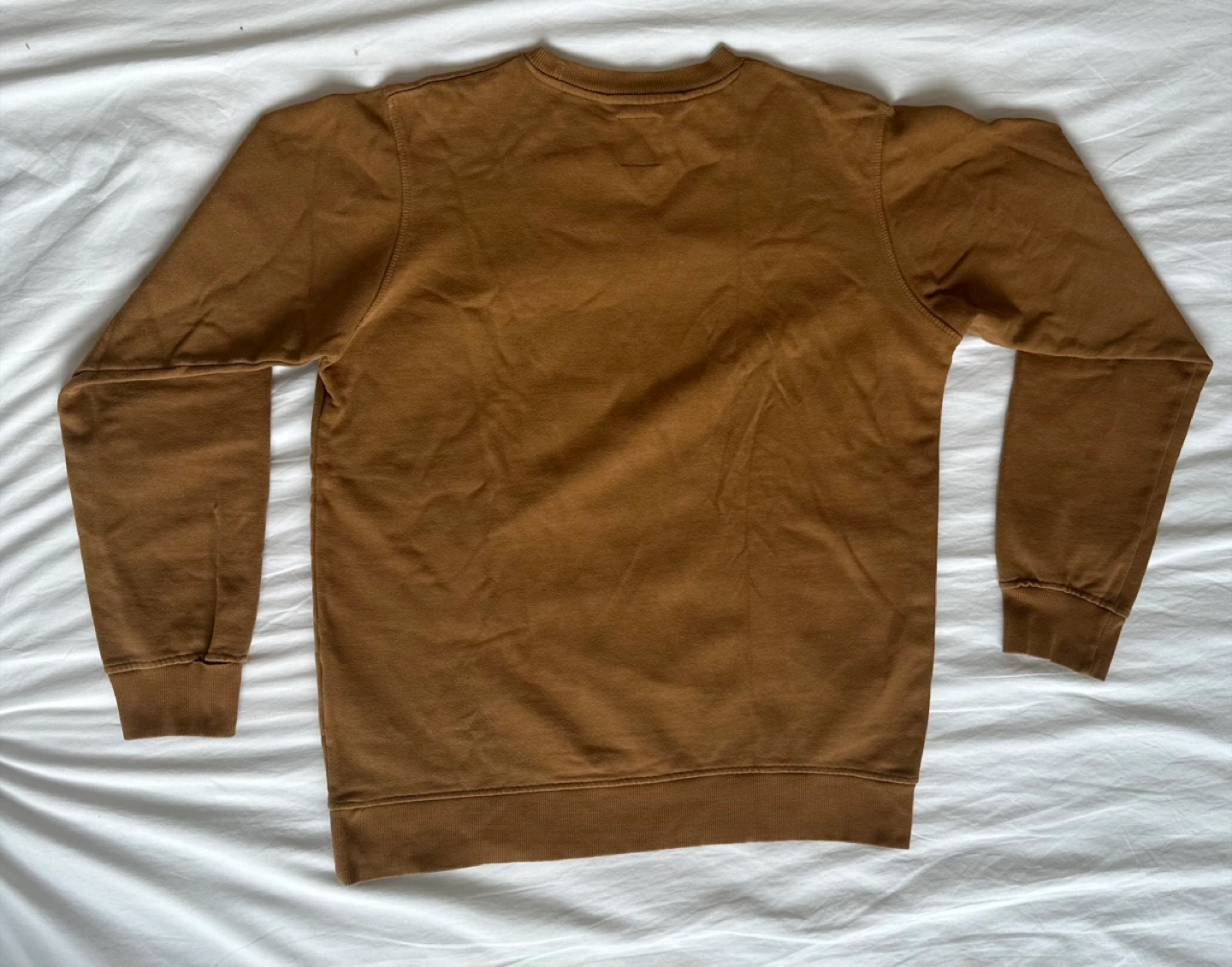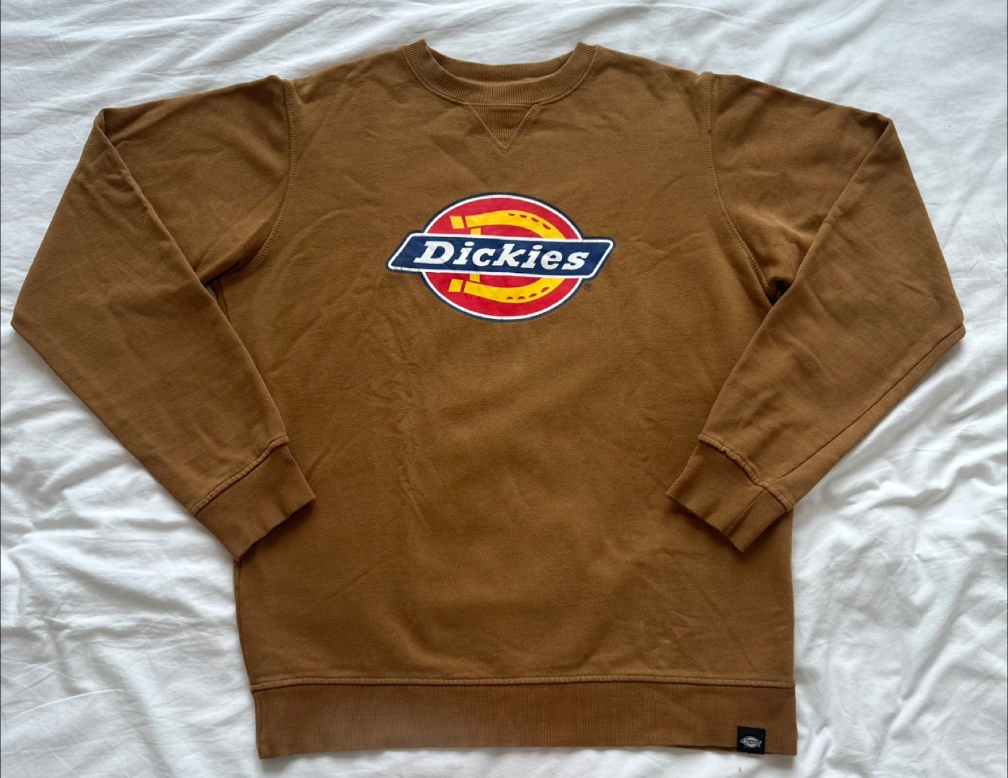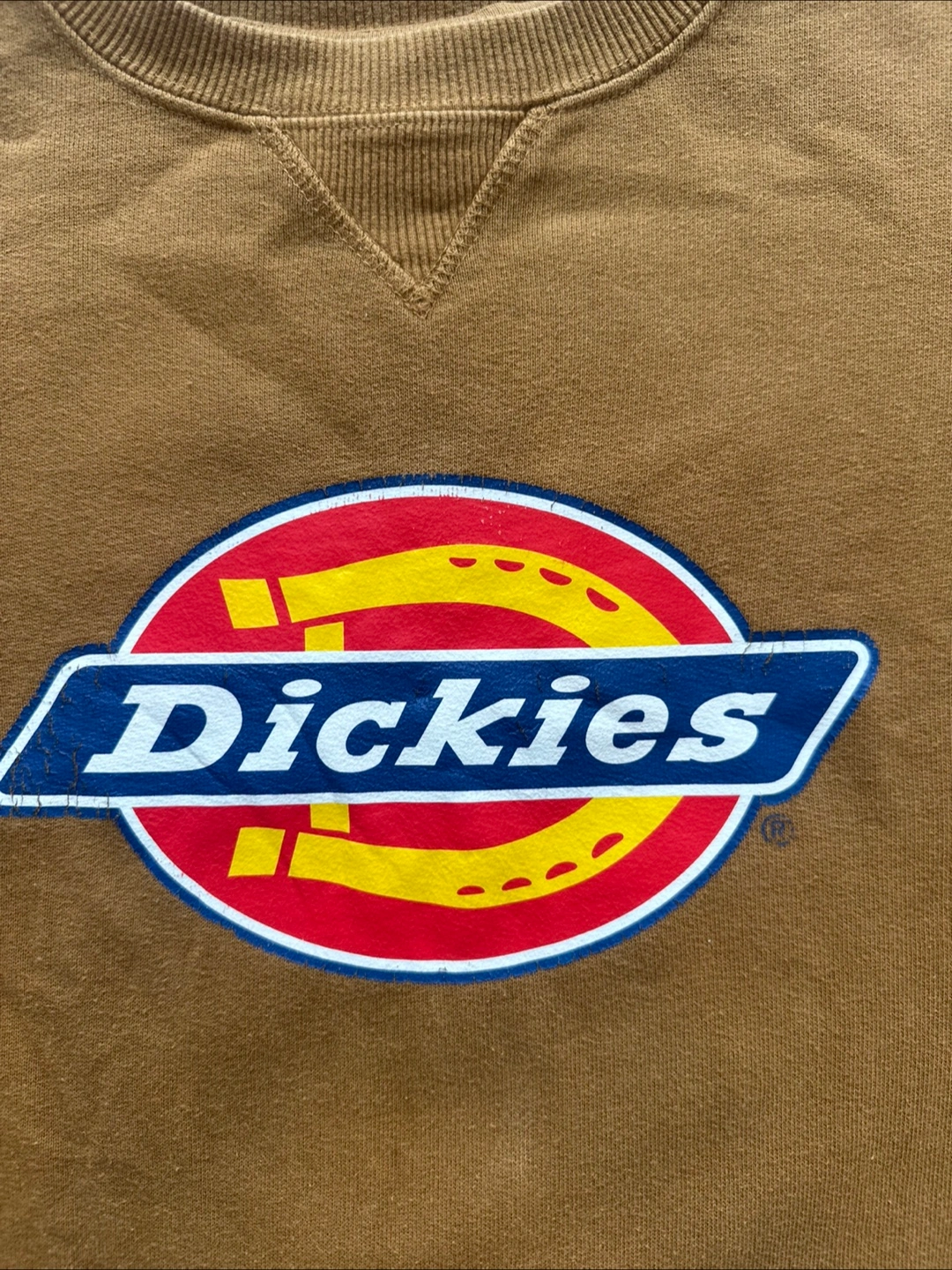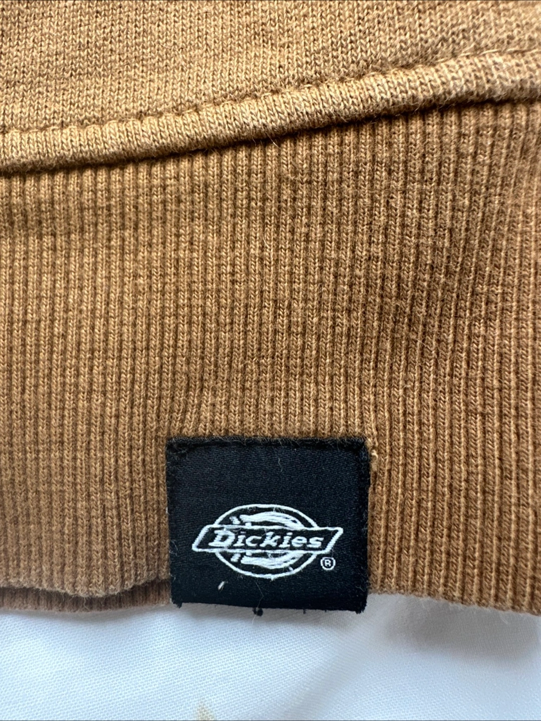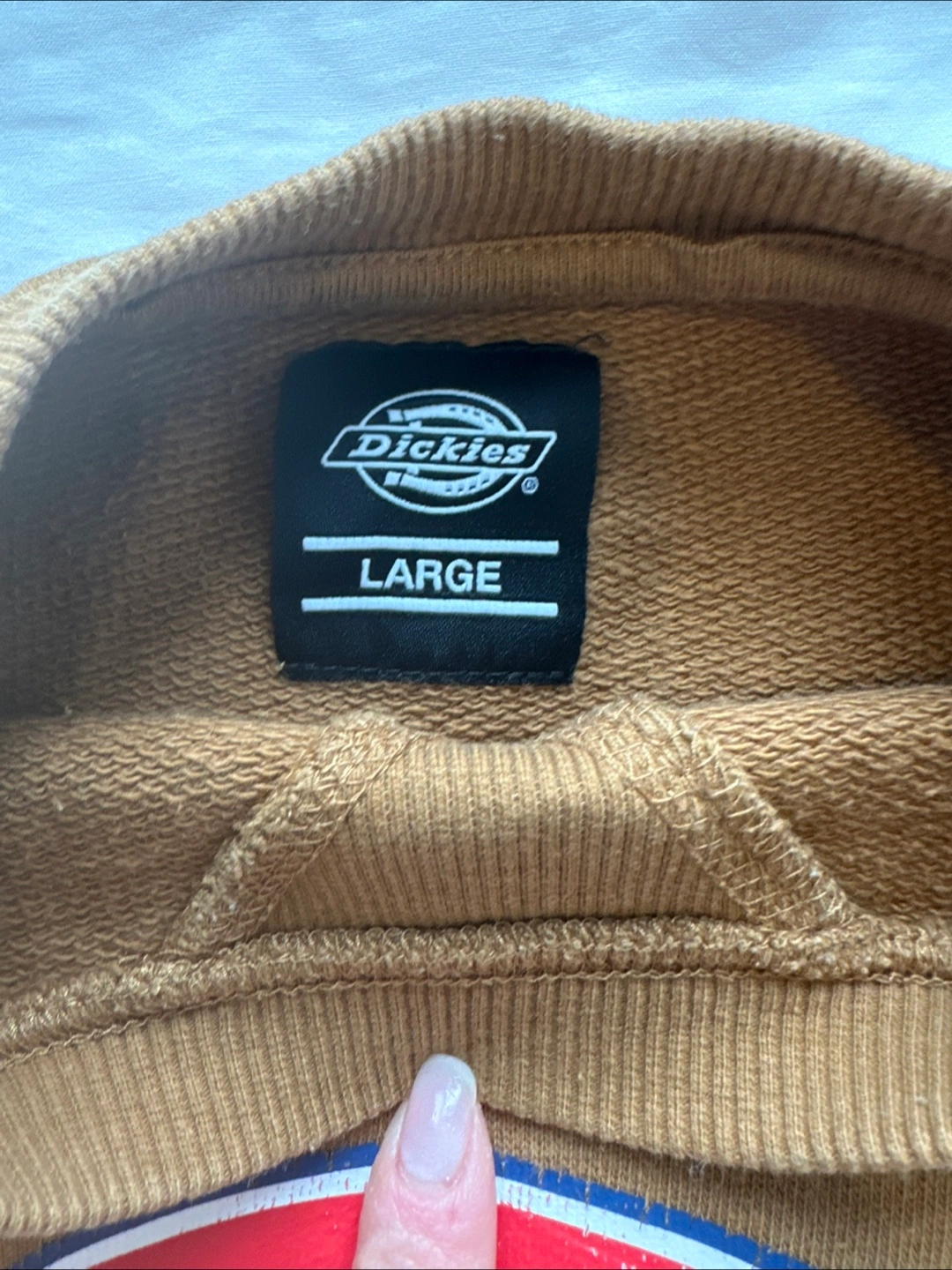 This is a brown crewneck sweatshirt from Dickies. It's a size large and made of a cotton blend. This pullover is great for casual wear.