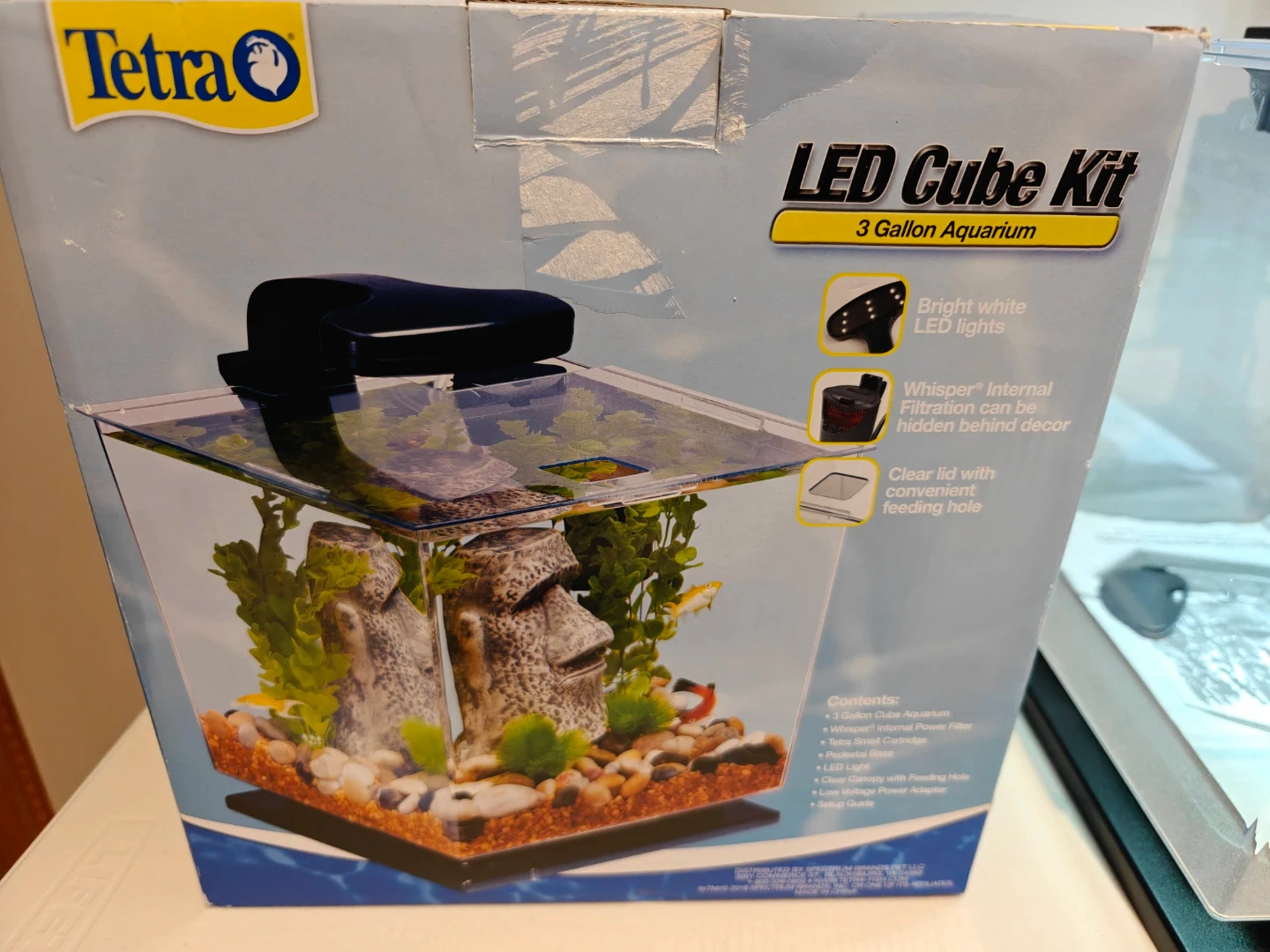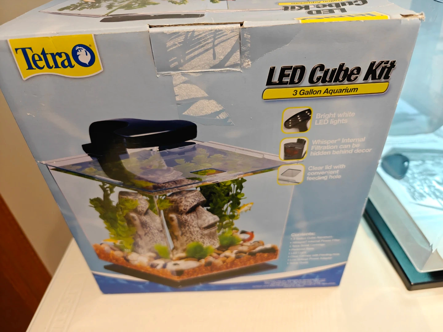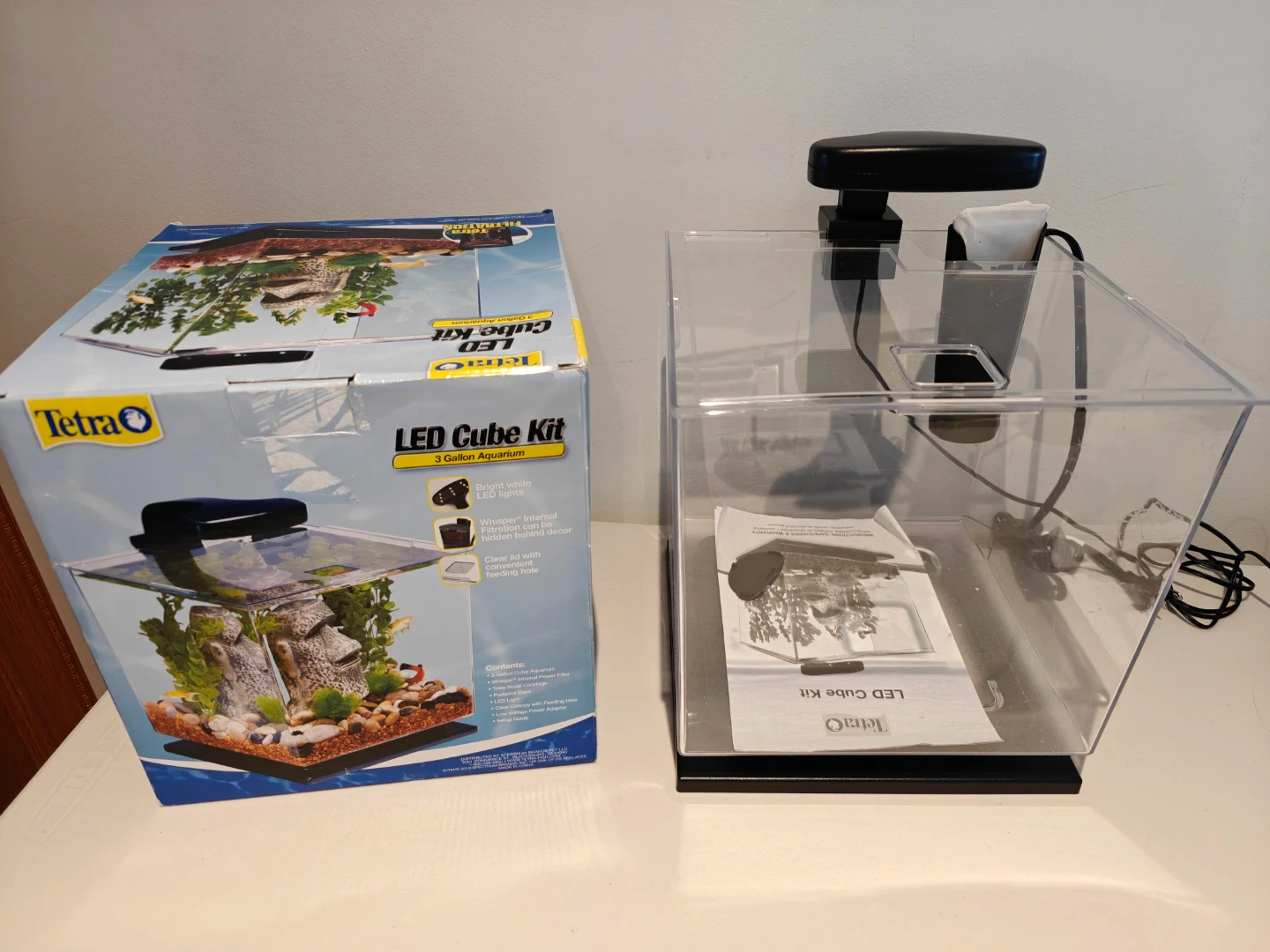 This is a Tetra LED Cube Kit aquarium with a 3-gallon capacity. It includes bright white LED lights and Whisper internal filtration that can be hidden behind decor. The lid is clear and has a convenient feeding hole.