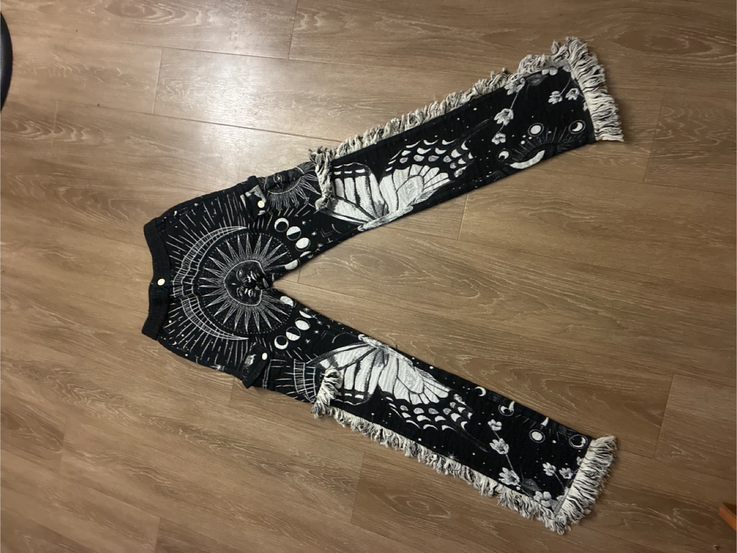 These black jeans feature a unique celestial print with moons, suns, and butterflies. They have a frayed hem and fringe detailing along the sides for added style. Jeans are made of denim material.