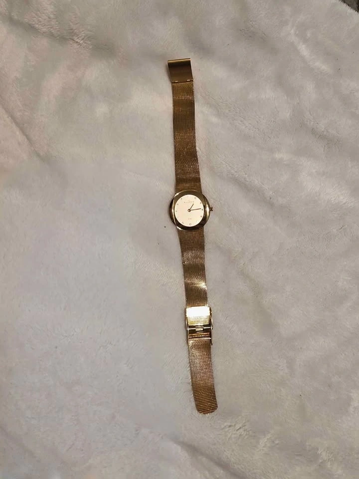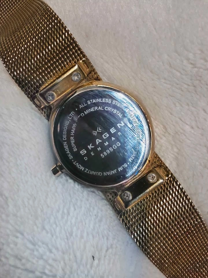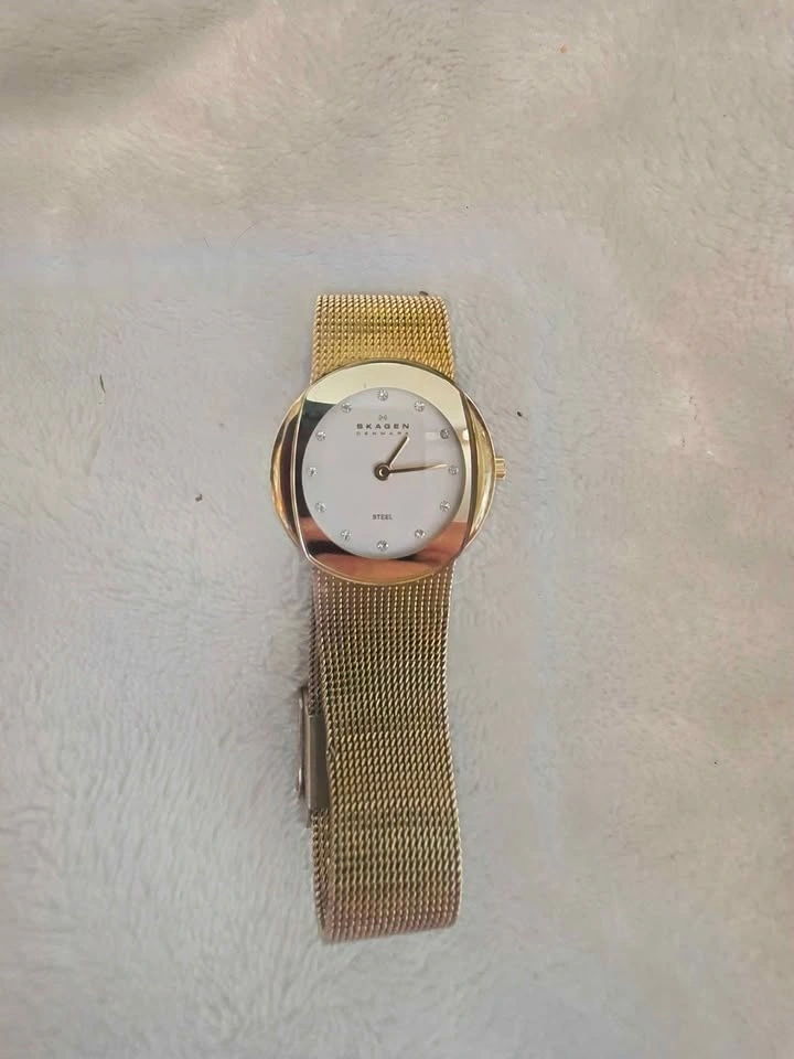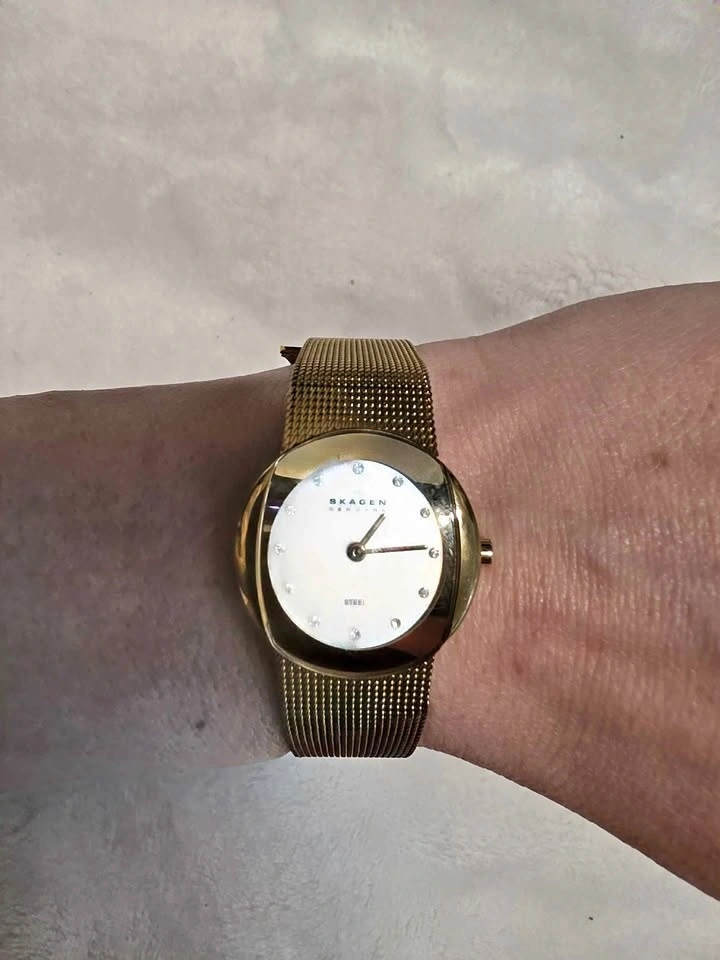 Beautiful Skagen ladies watch, gold tone with diamond dial numbers. Japan Movt stainless steel. Needs a battery. Check out my other listings for more vintage watches!