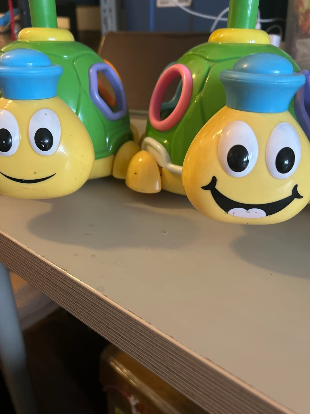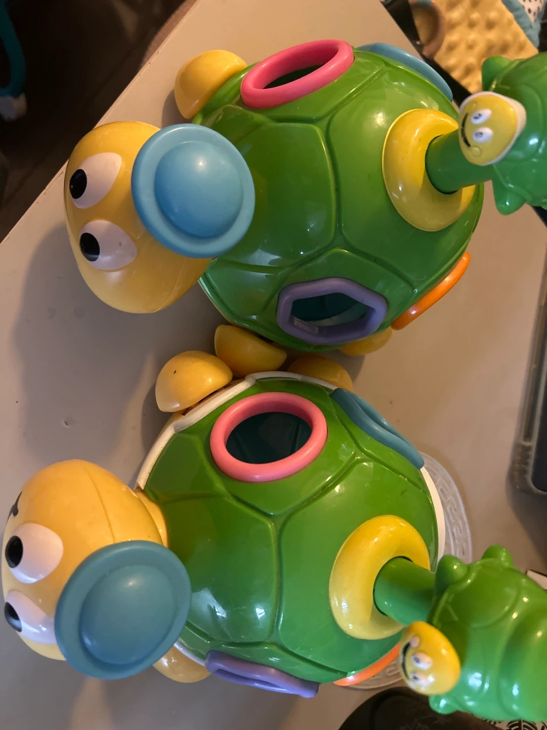 Two brightly coloured plastic turtle toys. They're shaped like turtles with yellow bug-like faces. These toys appear to be shape sorters with holes on top for putting shapes through. They're made of durable plastic and suitable for young children. These two turtles are very cute. One of them makes a sound when pressed, while the other doesn't.