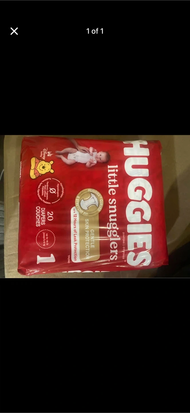 Huggies Little Snugglers diapers in size 1. These diapers are designed for gentle skin protection and offer up to 12 hours of leak protection. They come in a package containing 20 diapers.