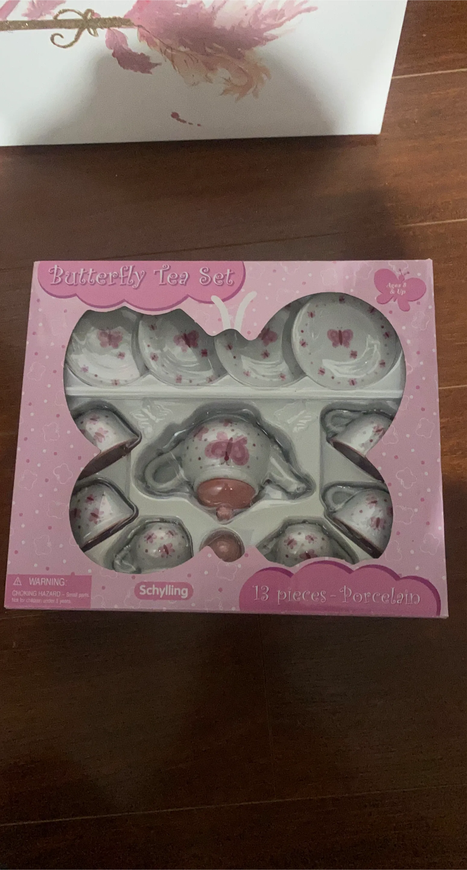 This is a Schylling Butterfly Tea Set with 13 pieces. It's made of porcelain and features a lovely butterfly design. Recommended for ages 8 and up.