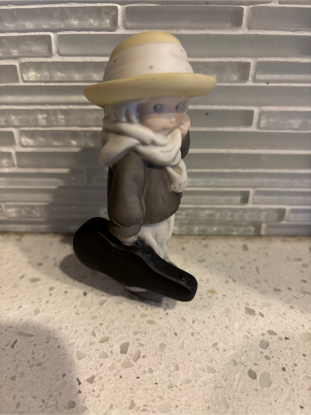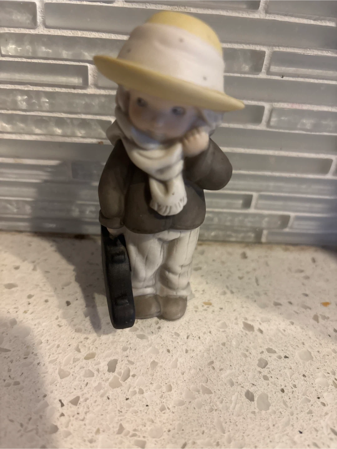 This charming ceramic figurine depicts a young girl wearing a hat and scarf, holding a violin case. It's made of porcelain with a matte finish. The detail on the clothing and accessories is well done.