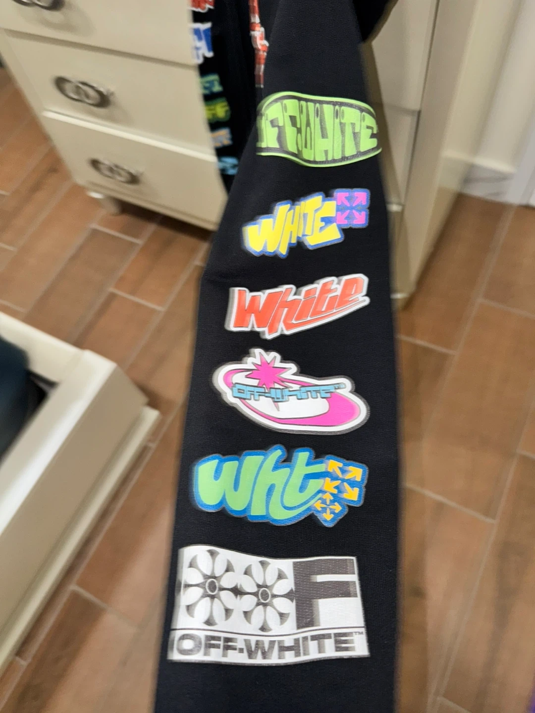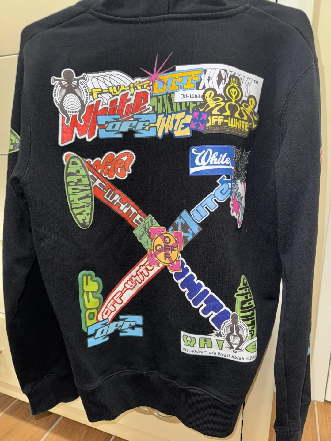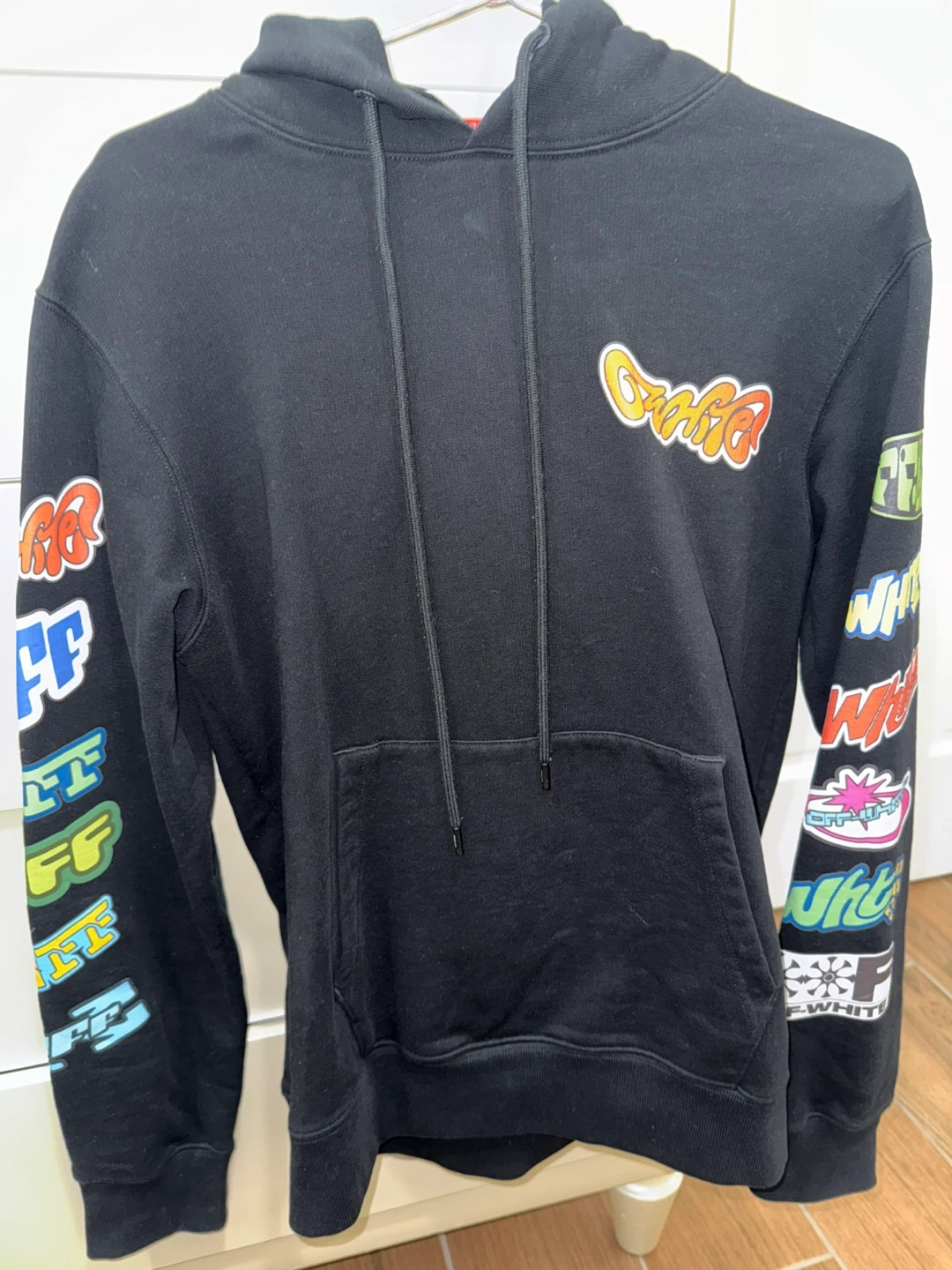 This is an Off-White black hoodie featuring a graphic print design on the back and sleeves. It's made from comfortable material and includes a front pocket and adjustable drawstring hood.