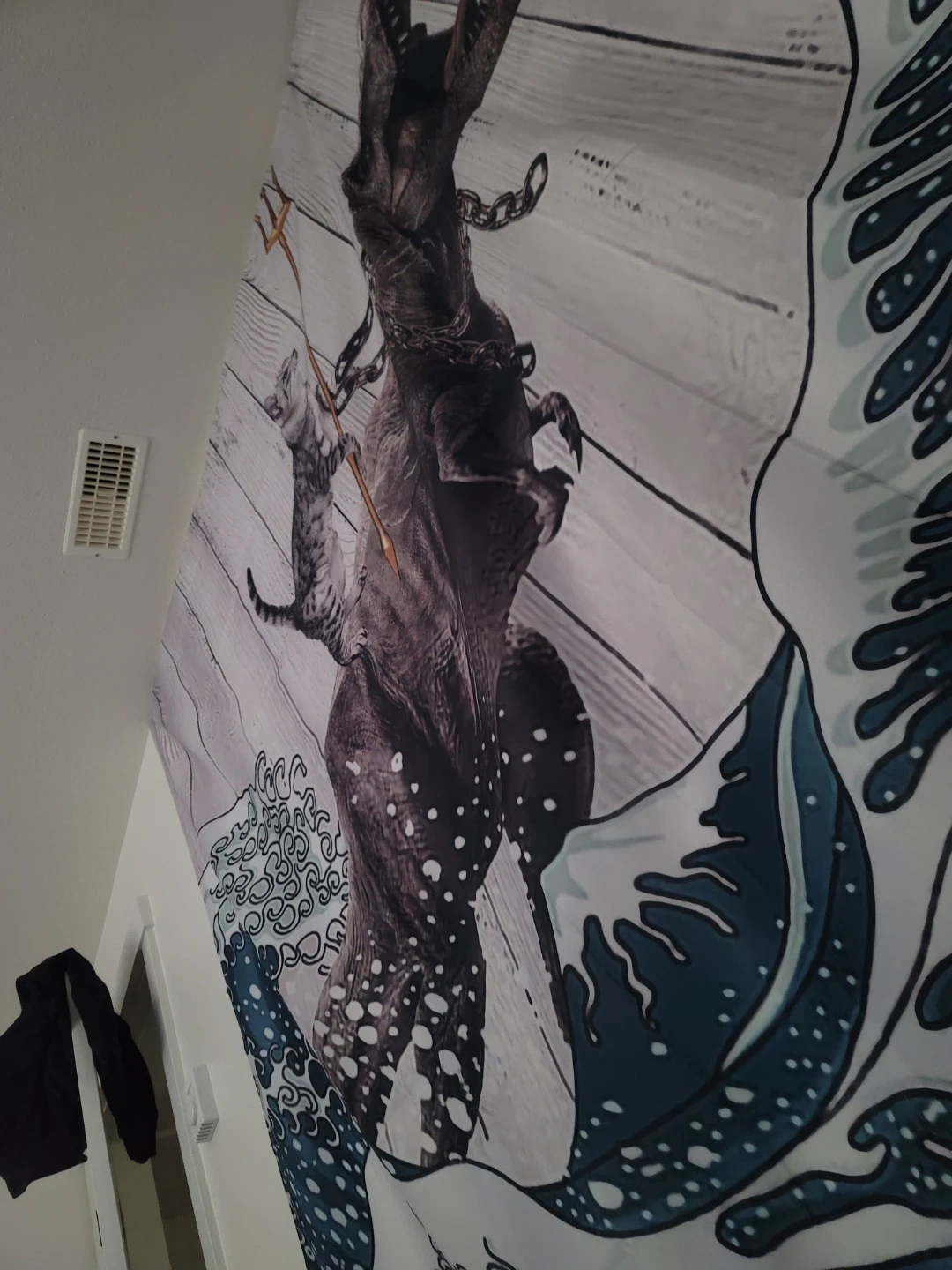 This tapestry features a unique design of a dinosaur being ridden by a cat, with a backdrop of stylized waves and a wooden texture. It's a striking piece for any room. Fabric material.