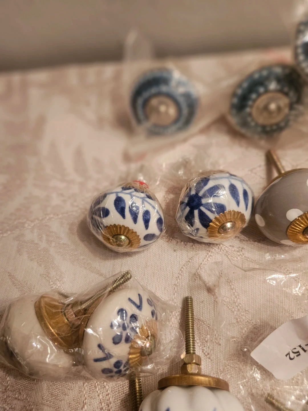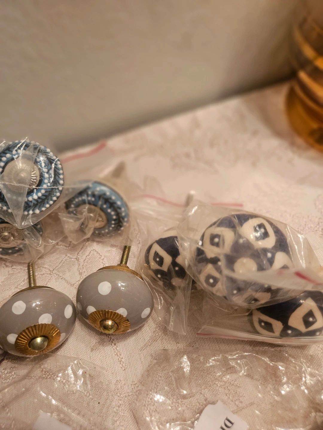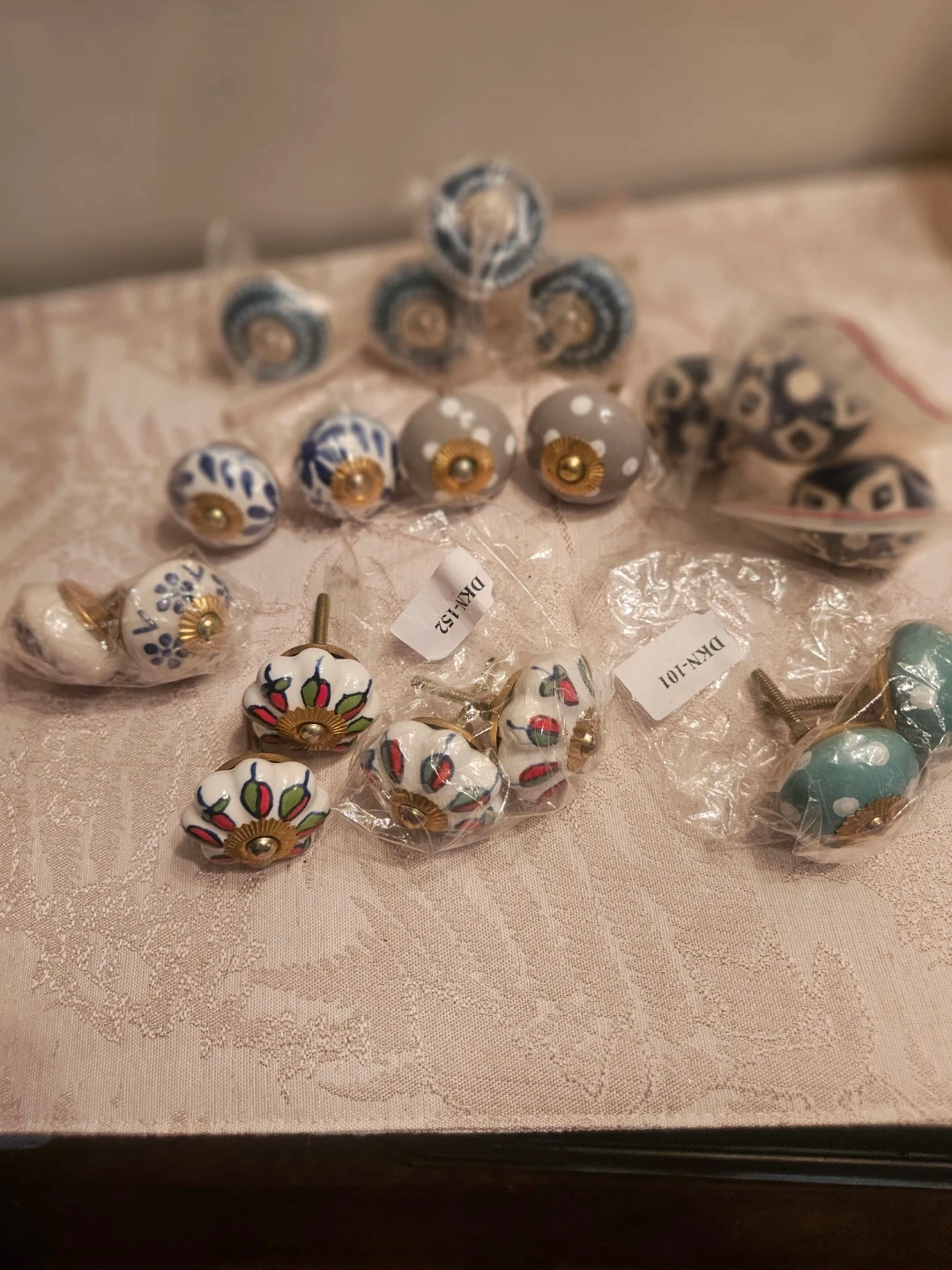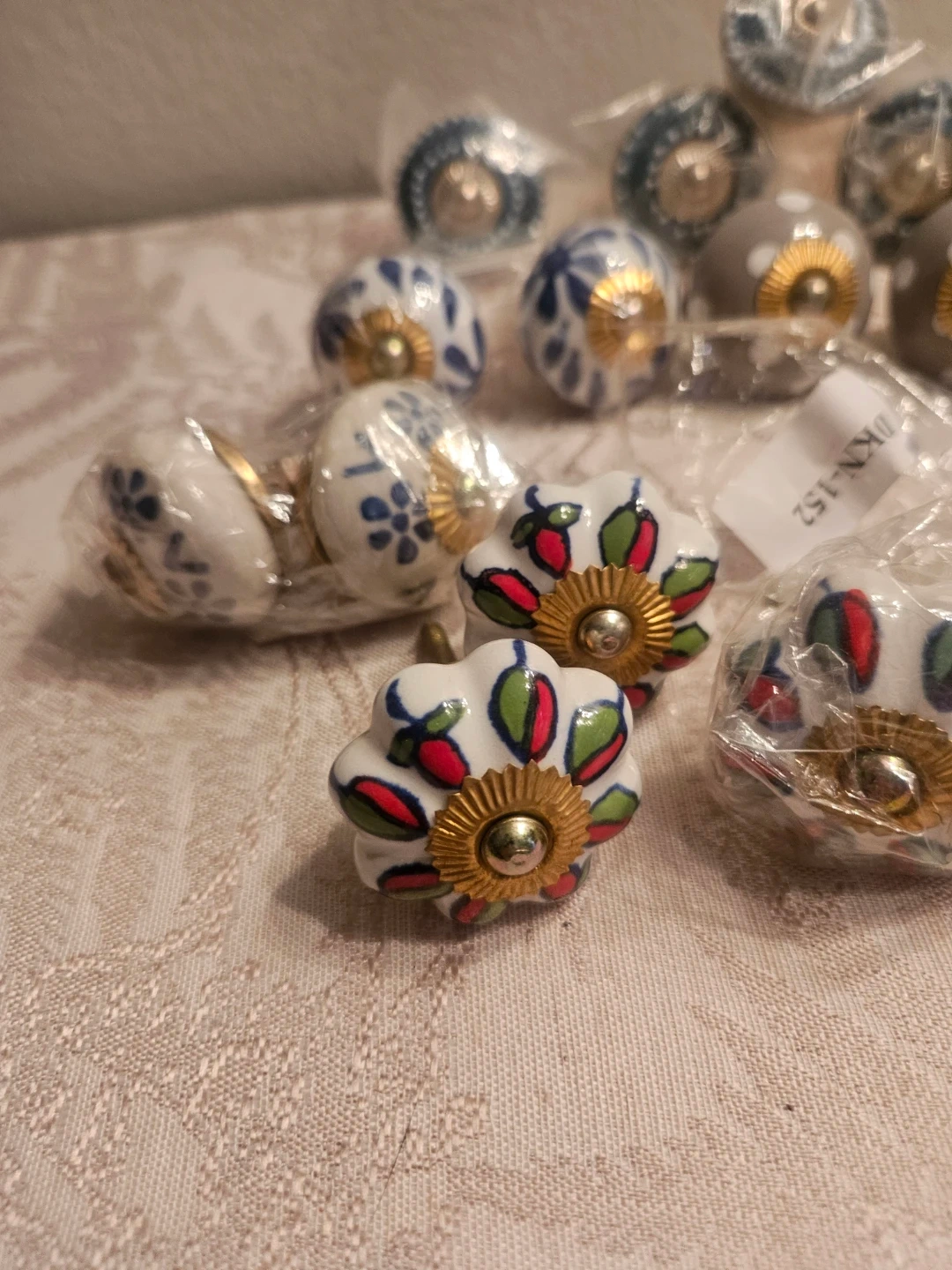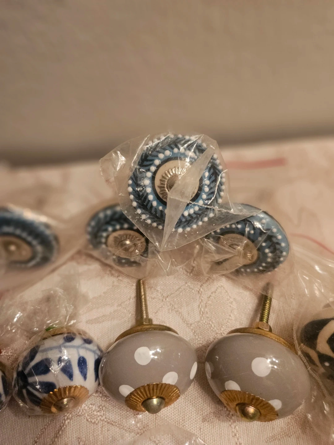 This set includes assorted decorative ceramic drawer knobs. Designs vary, featuring floral, polka dot, and patterned styles. Each knob is individually packaged with mounting hardware. Perfect for updating furniture and cabinets! 1pcs-$-5