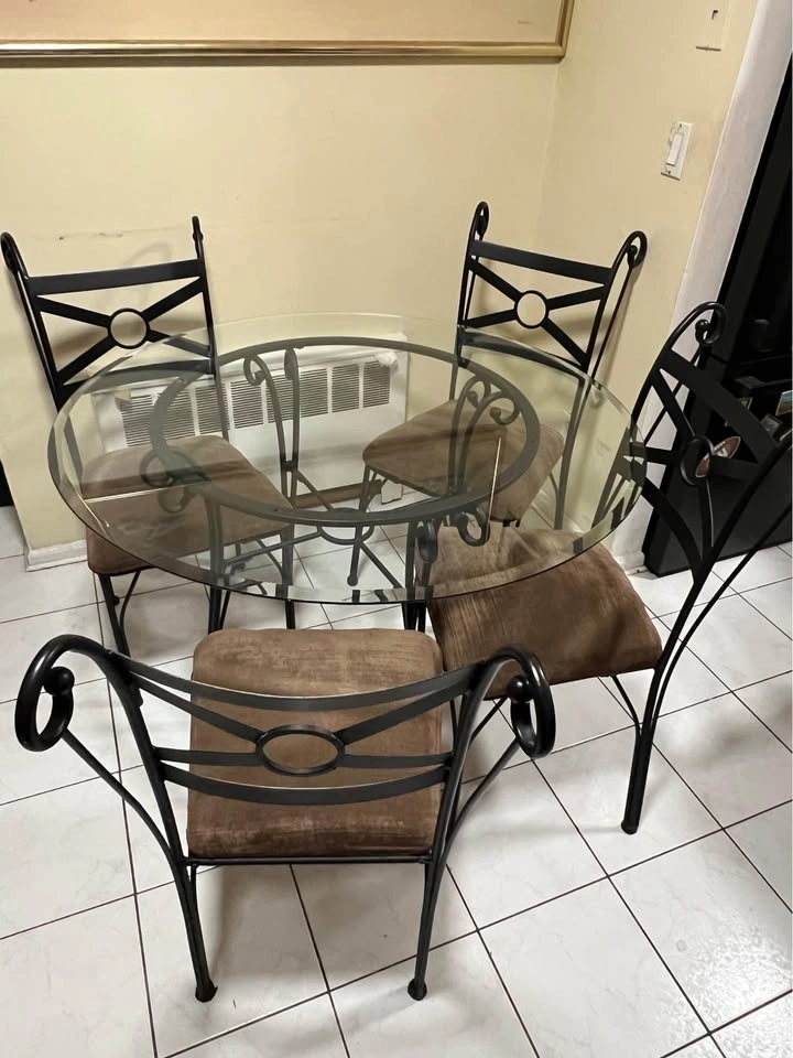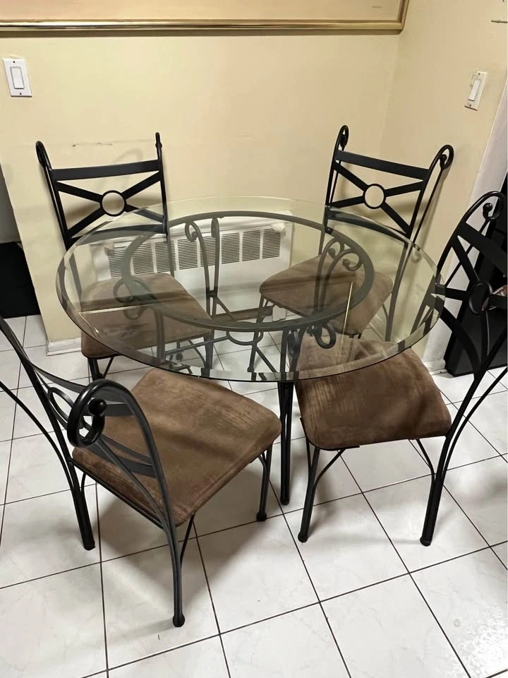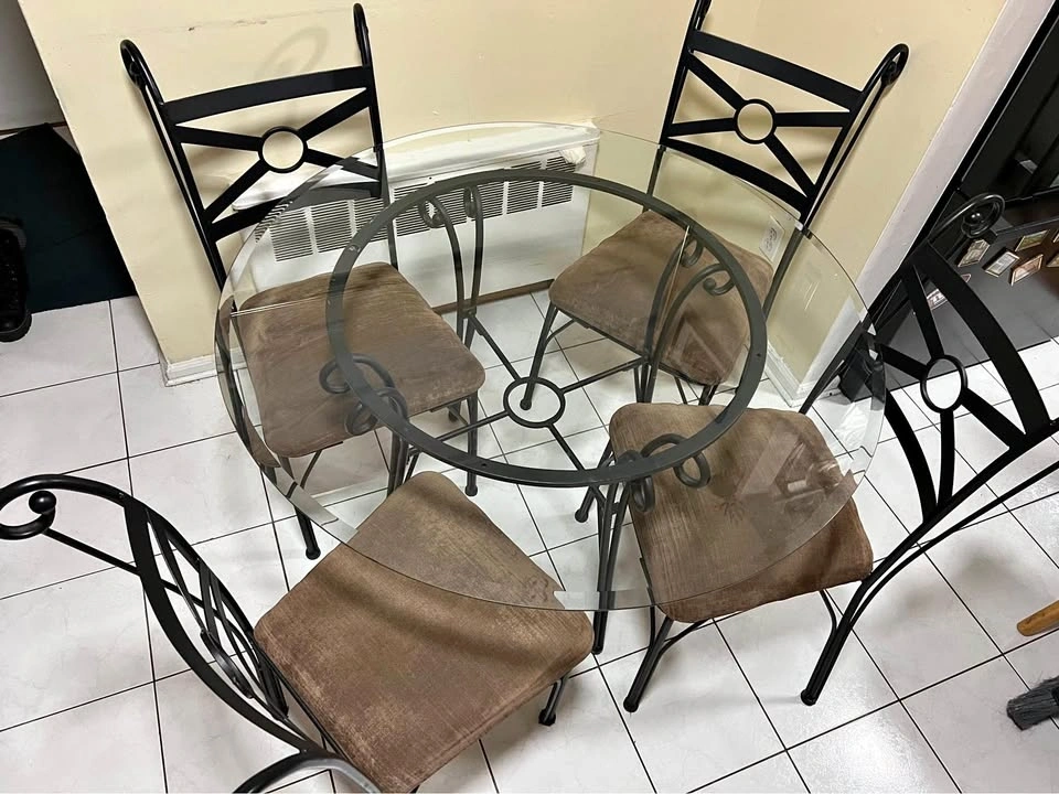 Stylish dining set! Round glass table with a black metal base featuring scrollwork design. Comes with 4 chairs with black metal frames and comfortable brown upholstered seats. The chairs also have scrollwork details. Great for a kitchen or small dining area.