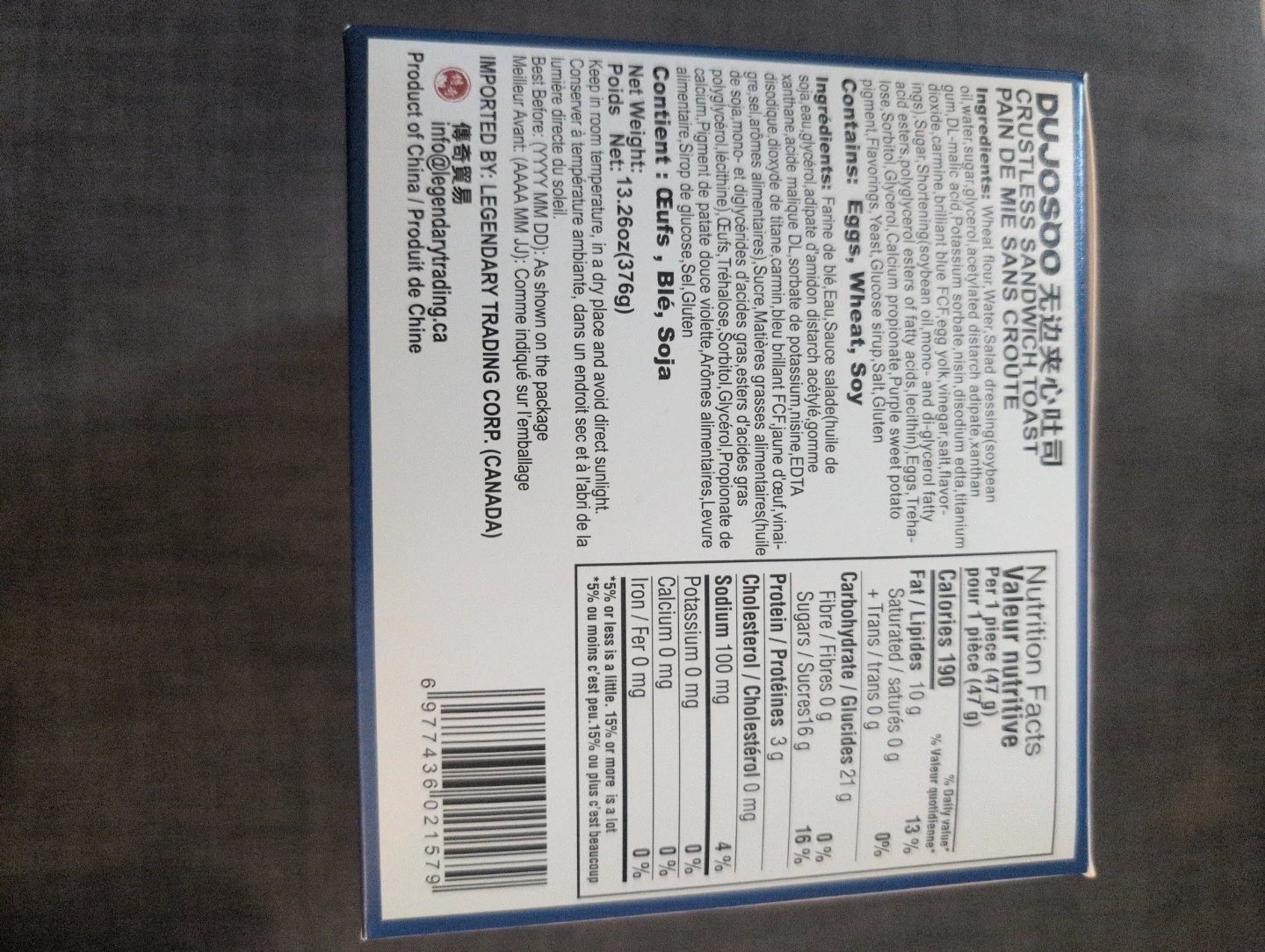 Crustless sandwich toast with taro flavour. It's soft and full of fillings. Contains wheat, eggs, soy, and milk. Best before: December 16, 2025.