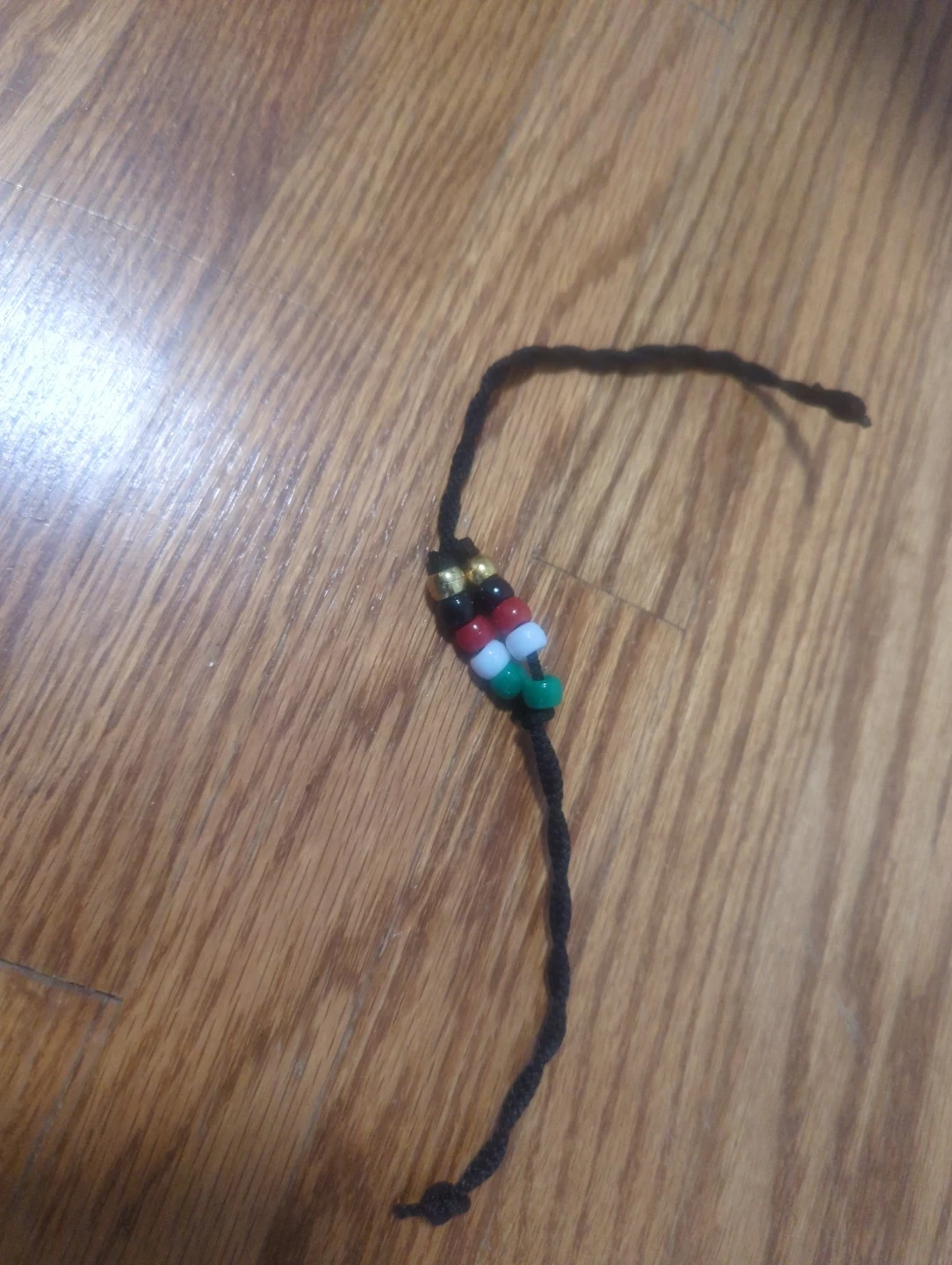 This is a handcrafted beaded bracelet with a black cord. It features a unique bead pattern with red, white, green, and gold accents. A simple and stylish accessory to add to your collection!