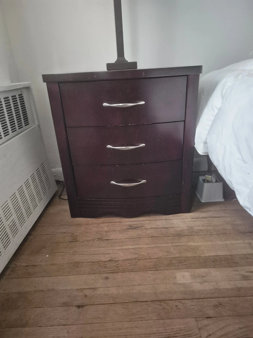 Dark wood nightstand with three drawers. It features silver-toned drawer pulls. This nightstand is made of wood.