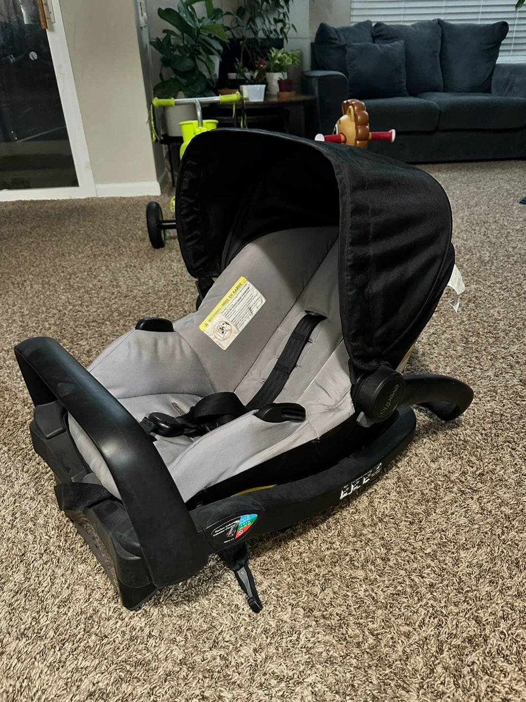 This is an Evenflo infant car seat. It's black and gray with a padded interior and adjustable harness. Includes the base for easy installation. Great for transporting your baby safely!