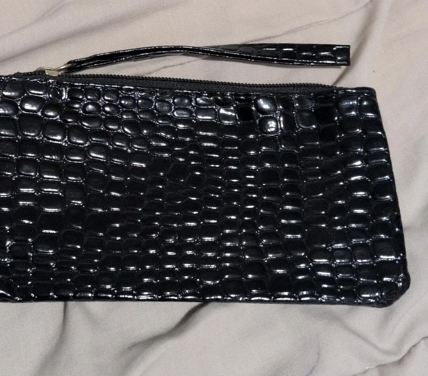 This is a black clutch wristlet with a croc embossed pattern. It's made of shiny patent material. The wrist strap is attached with a zipper closure. Bought on line, never use.