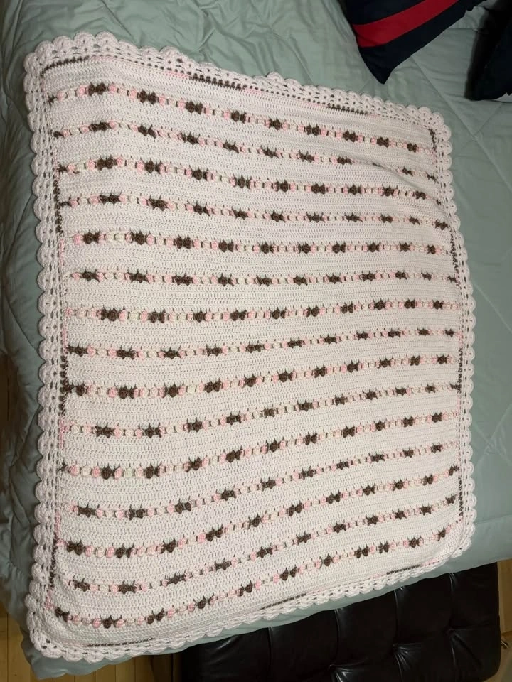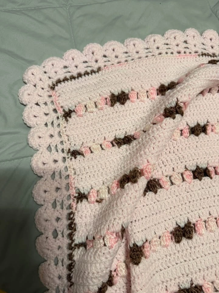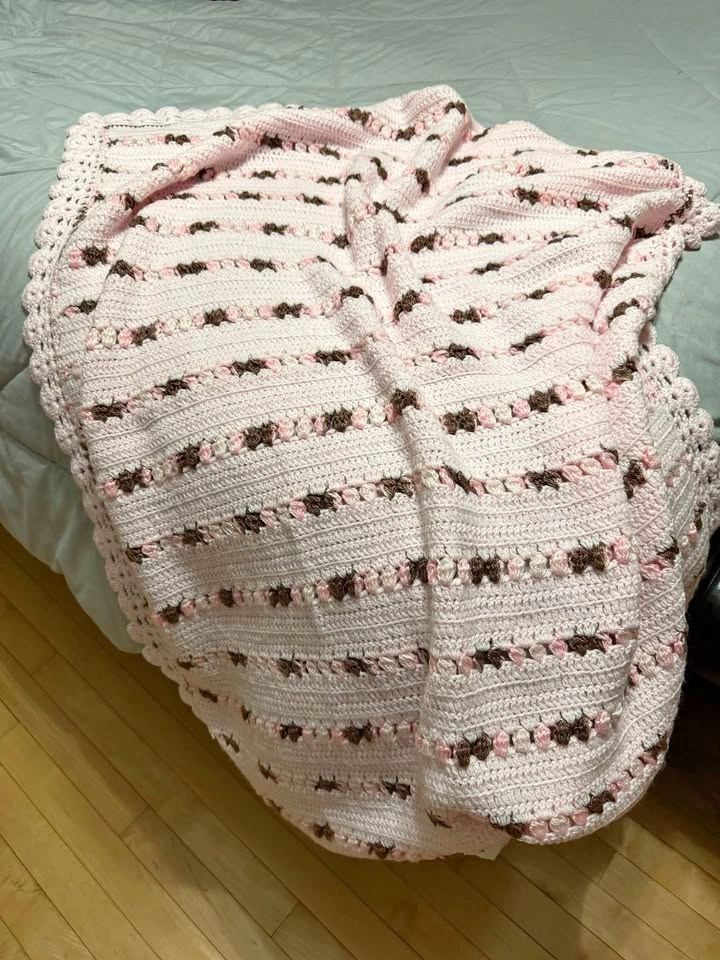 Beautiful hand crocheted throw blanket in soft blush pink with delicate cream and mocha accents throughout. The textured stripe design and scalloped border give it such a charming vintage feel, and the craftsmanship really stands out in person.