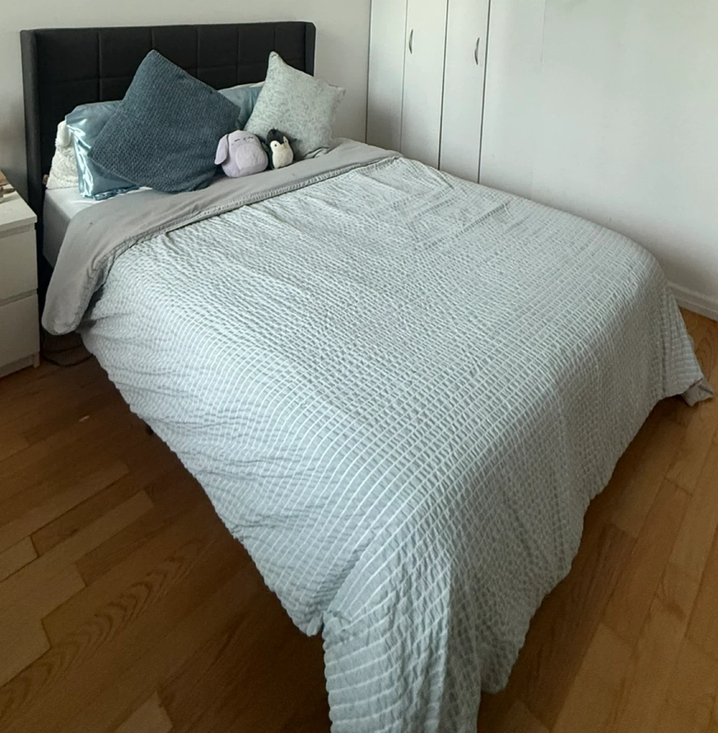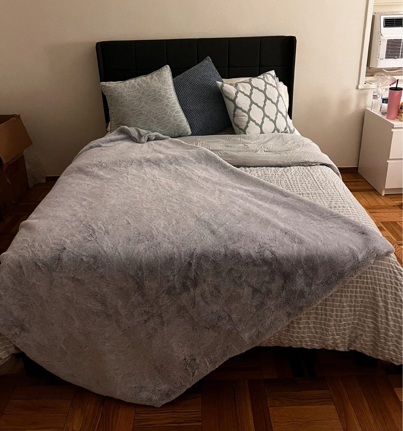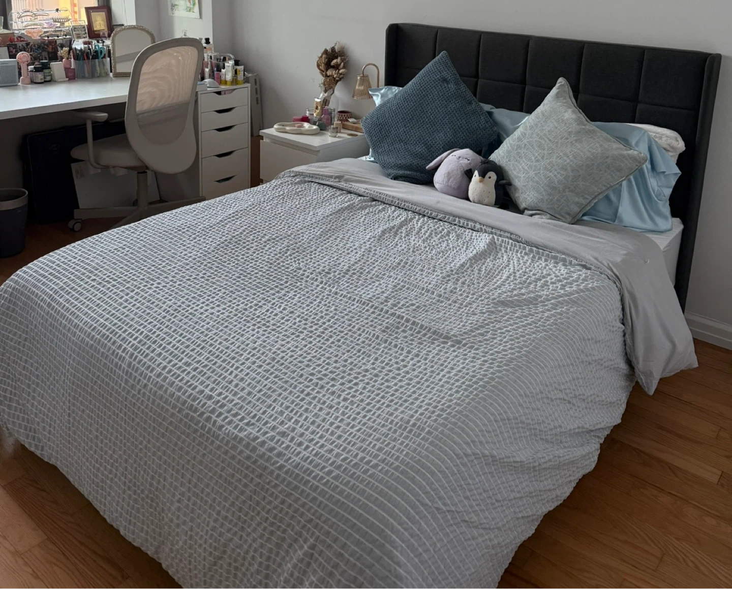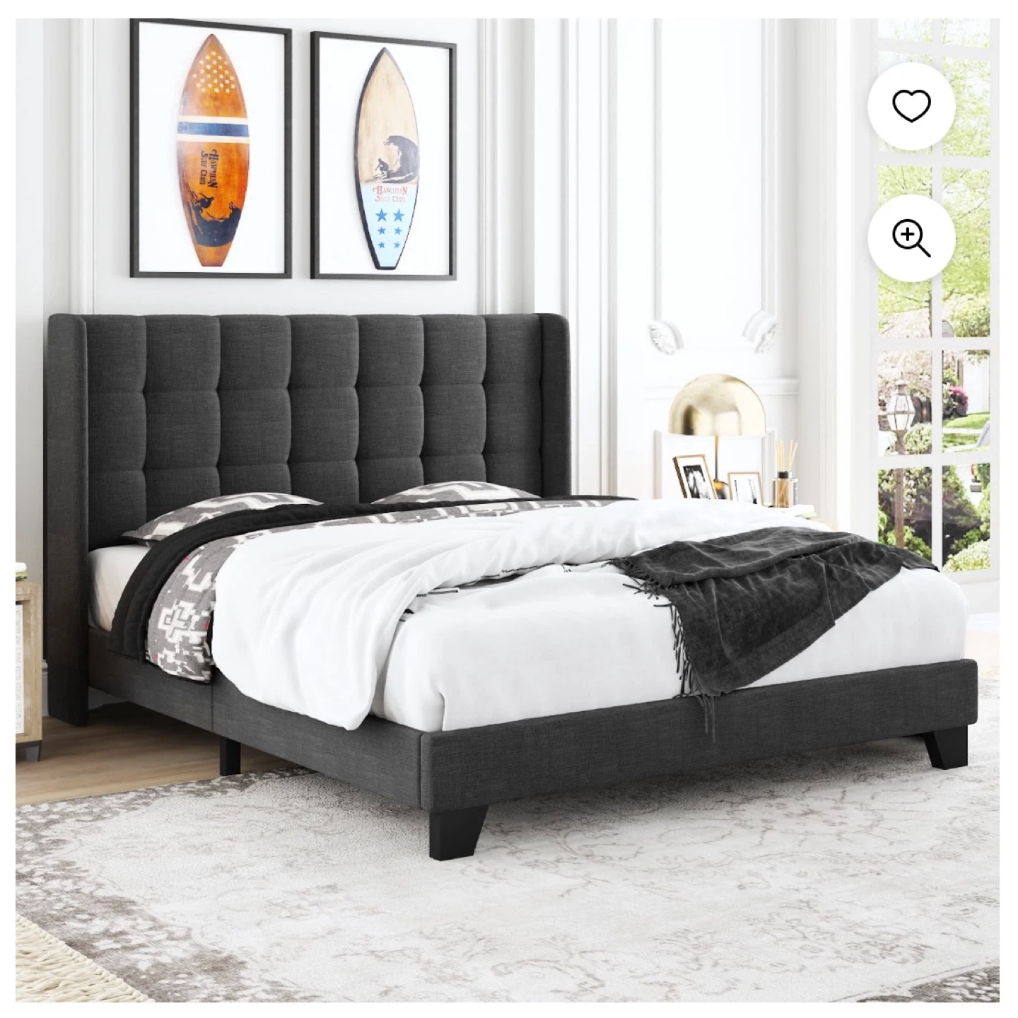 This stylish bed frame features a tufted, headboard upholstered in dark gray fabric. It's a full-sized bed, perfect for updating any bedroom!