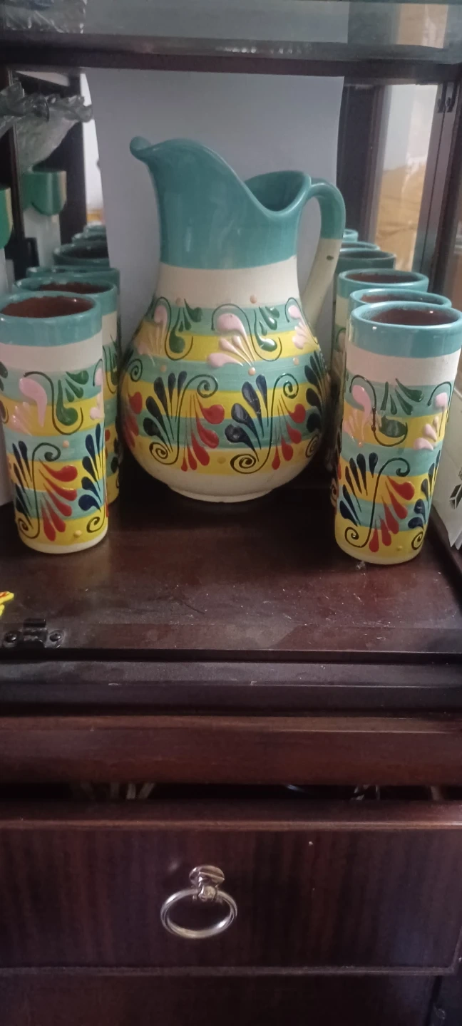 This colorful ceramic set includes one pitcher and six tumblers, each hand-painted with a vibrant folk art design.