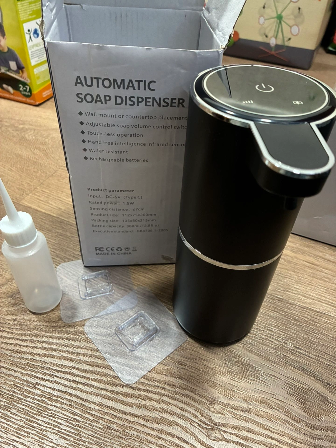 Automatic foaming soap dispenser with 4-level adjustable foam. Features a wall mount and USB rechargeable battery. Holds 12.8oz (380ml) of liquid. Touchless operation for hand or dish soap. Suitable for bathrooms, kitchens, hotels, and restaurants. Let me know if you're interested!