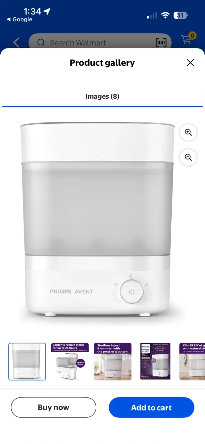 Philips Avent electric steam sterilizer. It sterilizes in just 6 minutes with the press of a button. Contents remain sterile for up to 24 hours with the lid unopened.