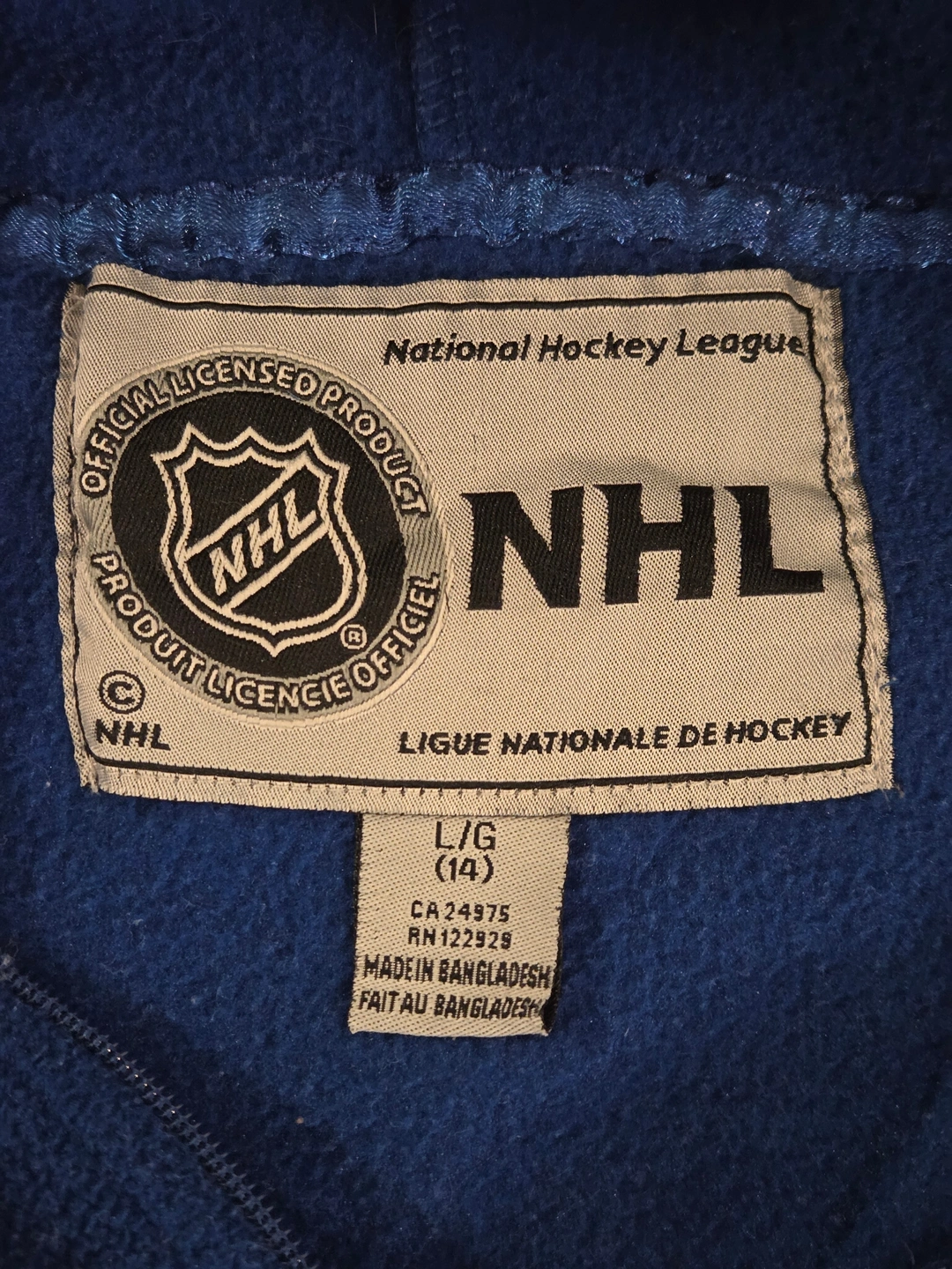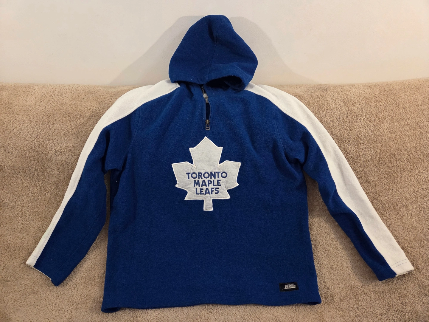 Cozy official NHL fleece hoodie in classic Toronto Maple Leafs blue with white shoulder stripes. Big felt/embroidered Leafs crest on the chest, quarter-zip, raglan sleeves and a roomy hood. Size Youth L (14). Made for everyday wear to the rink, school or game nights.