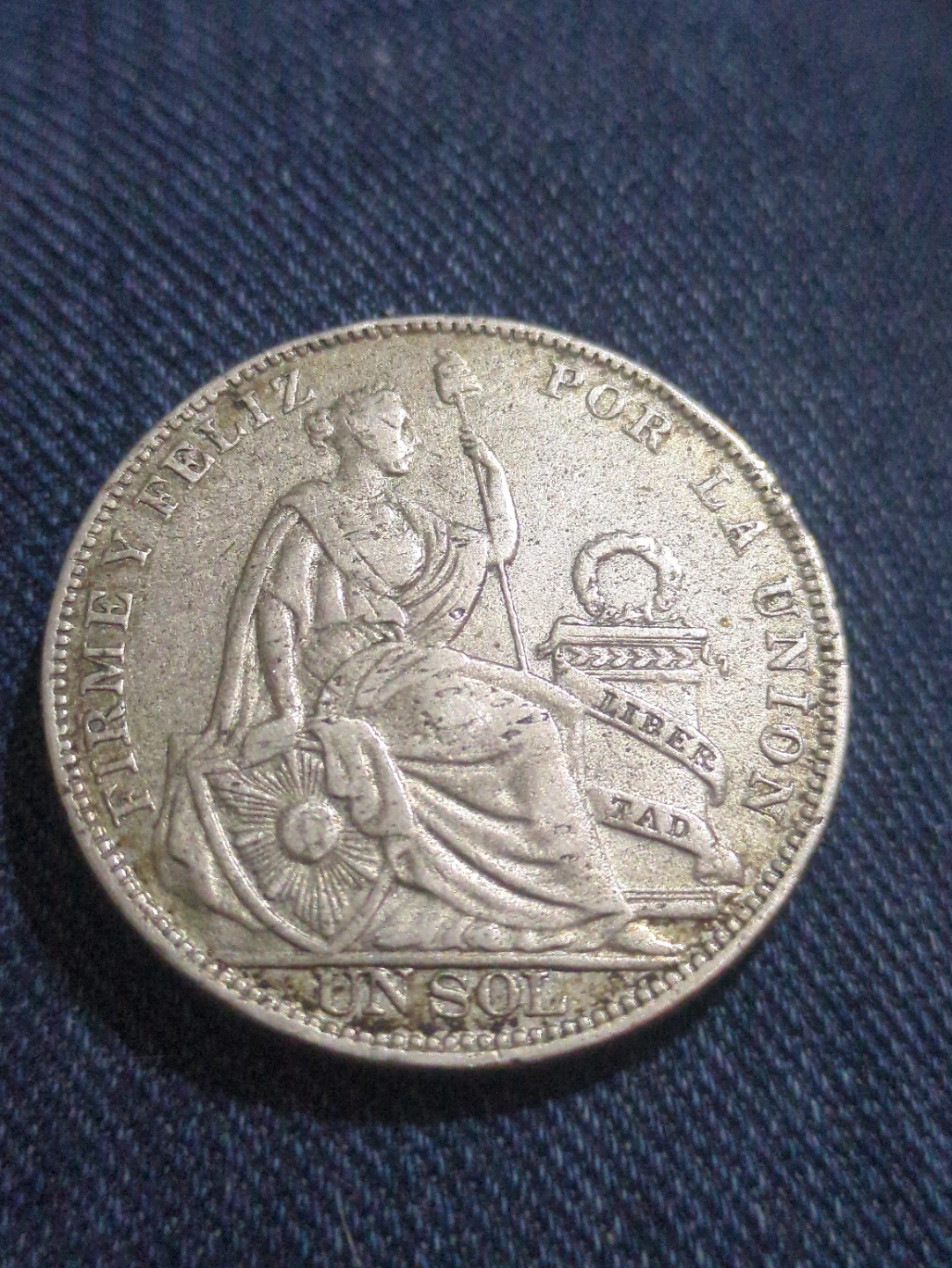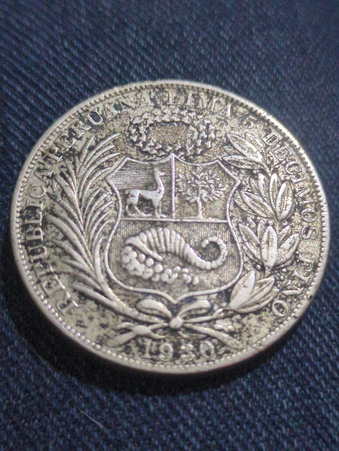 This is a Peruvian 1 Sol coin from 1930. It features the coat of arms of Peru on one side and a seated allegorical figure on the other. The coin is made of silver.