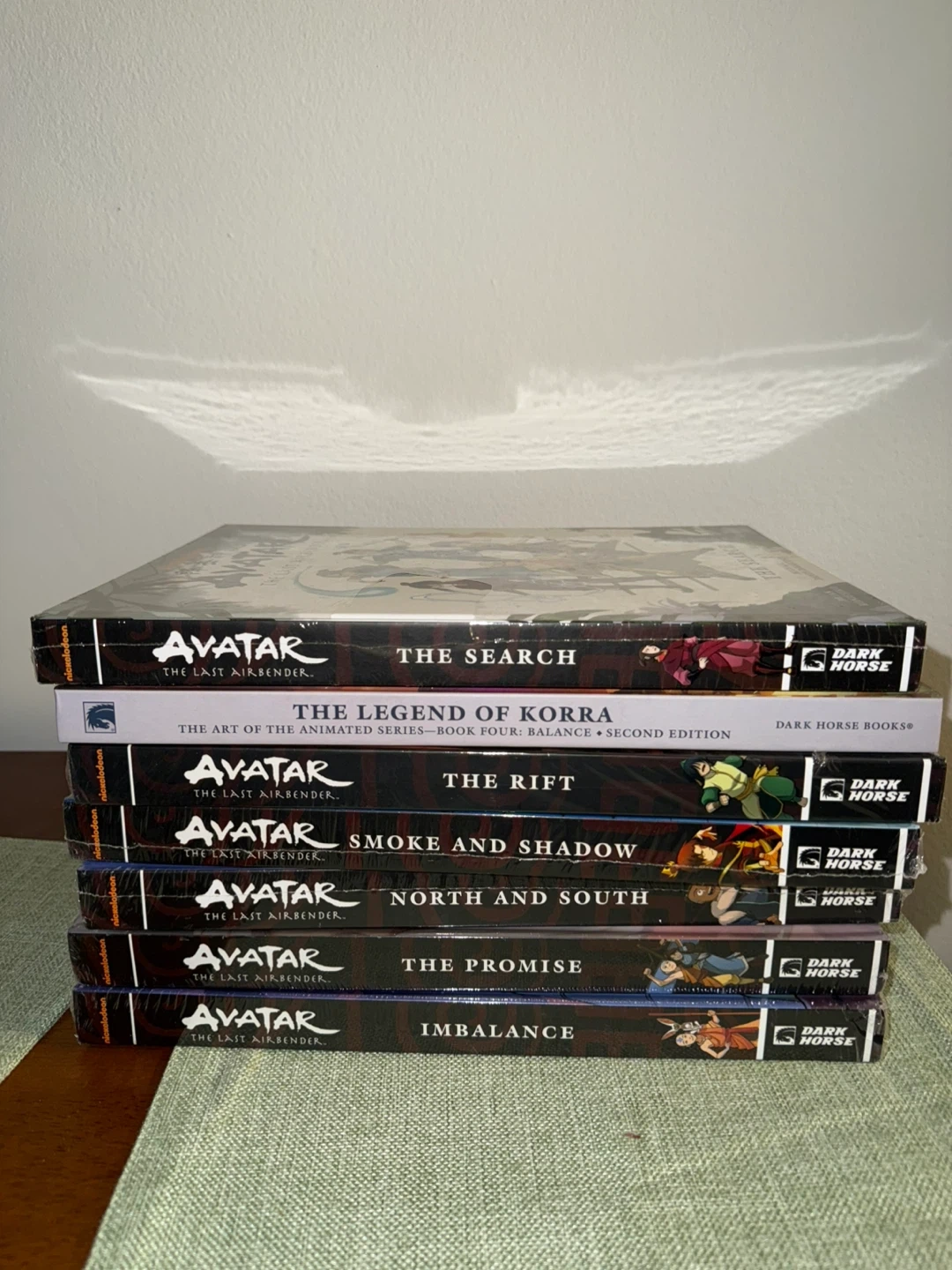 This set includes several Avatar: The Last Airbender graphic novels: The Search, The Rift, Smoke and Shadow, North and South, The Promise, and Imbalance. It also includes The Legend of Korra: The Art of the Animated Series - Book Four: Balance, Second Edition. All books are published by Dark Horse Comics.