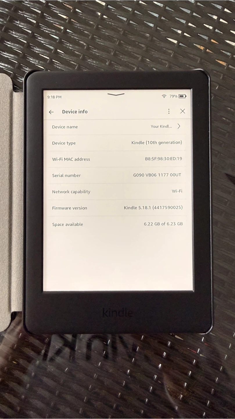 This is a Kindle 10th generation e-reader. It features a 6-inch display with built-in adjustable light. It's Wi-Fi enabled and comes with 6.22 GB of available storage. This device is great for reading books on the go!