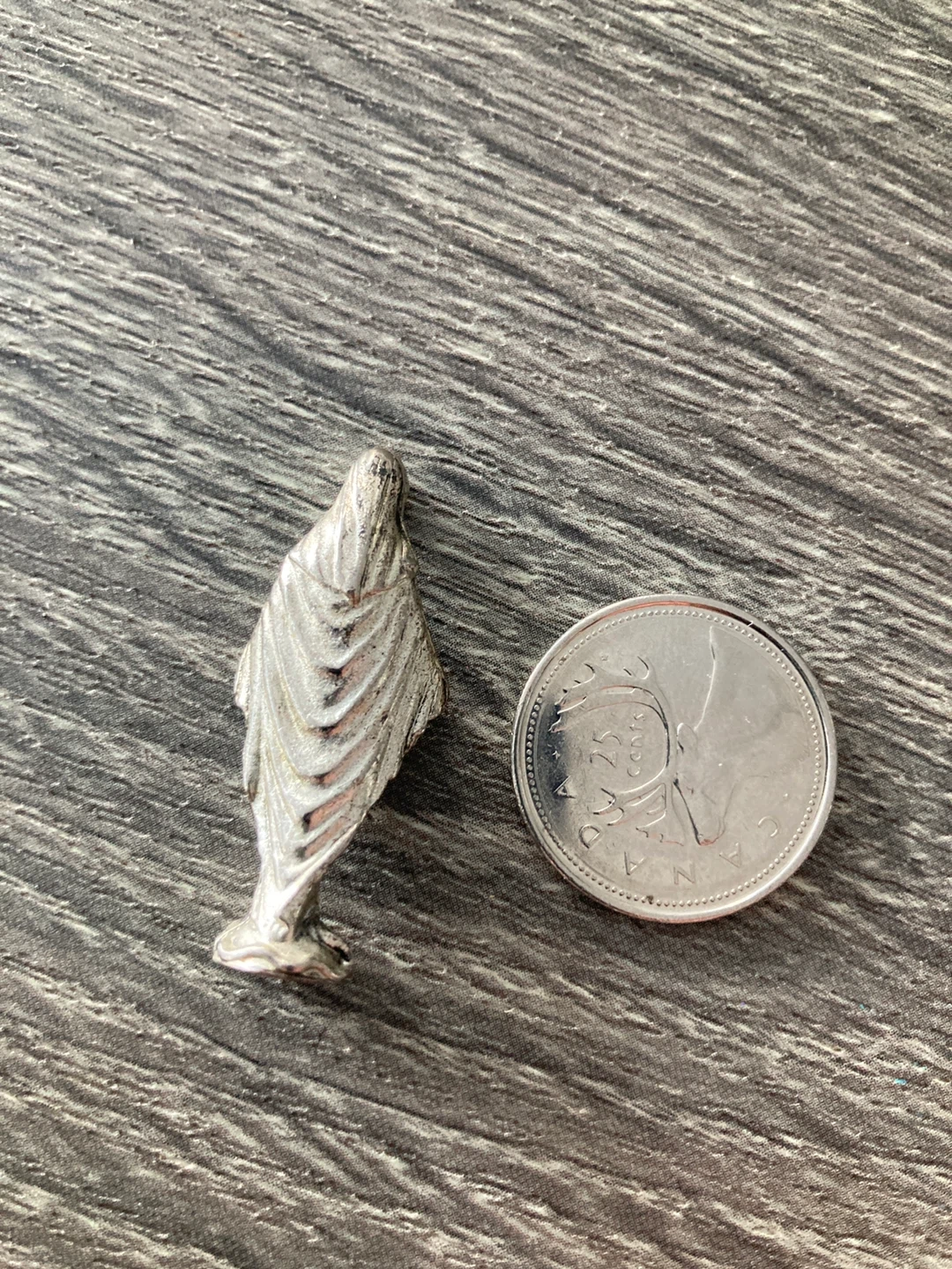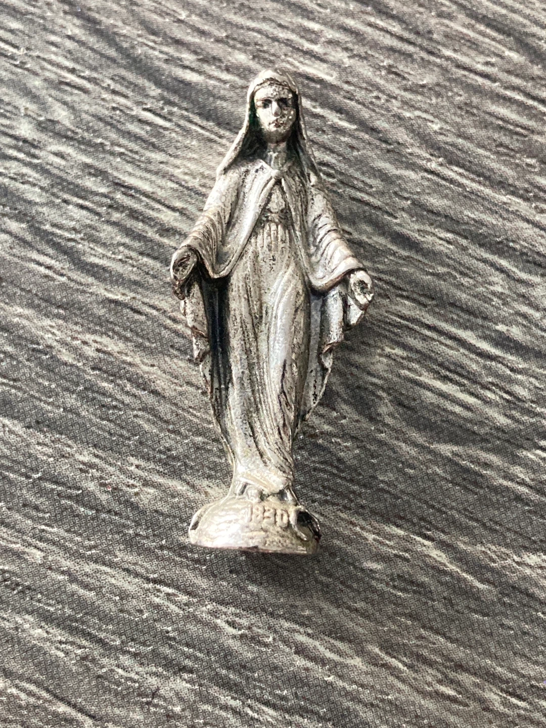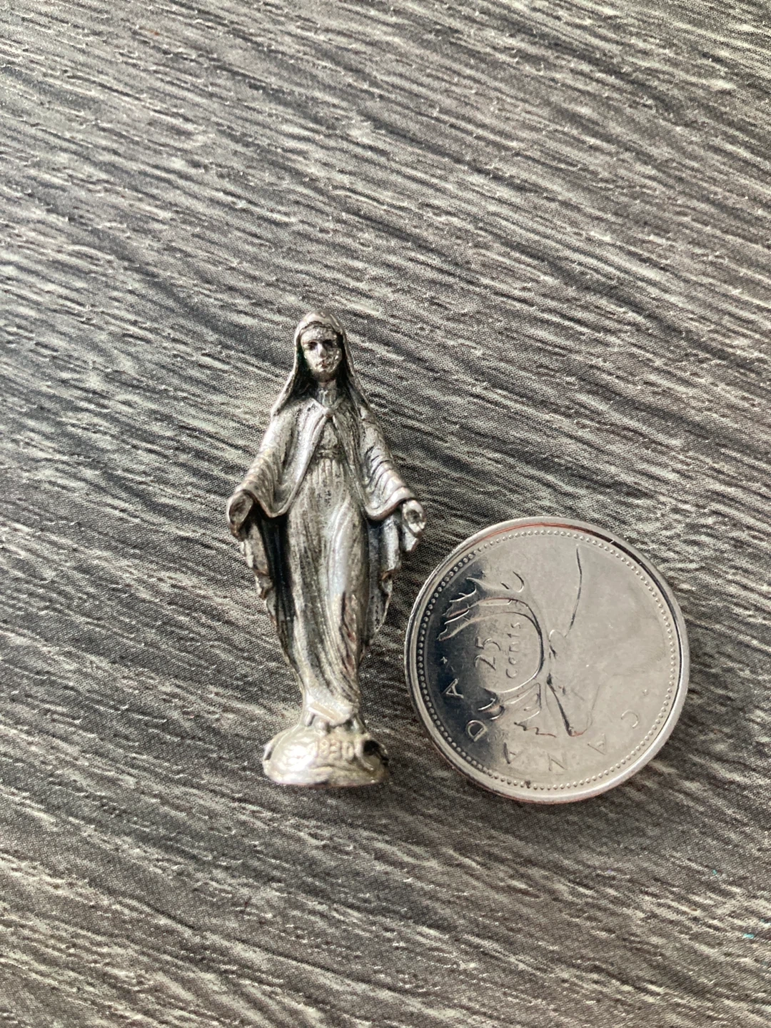 Small metal figurine of the Virgin Mary, likely silver-toned. It stands approximately the height of a Canadian quarter. The base has some markings, but they are illegible. It's a delicate piece, suitable for display or personal devotion.
