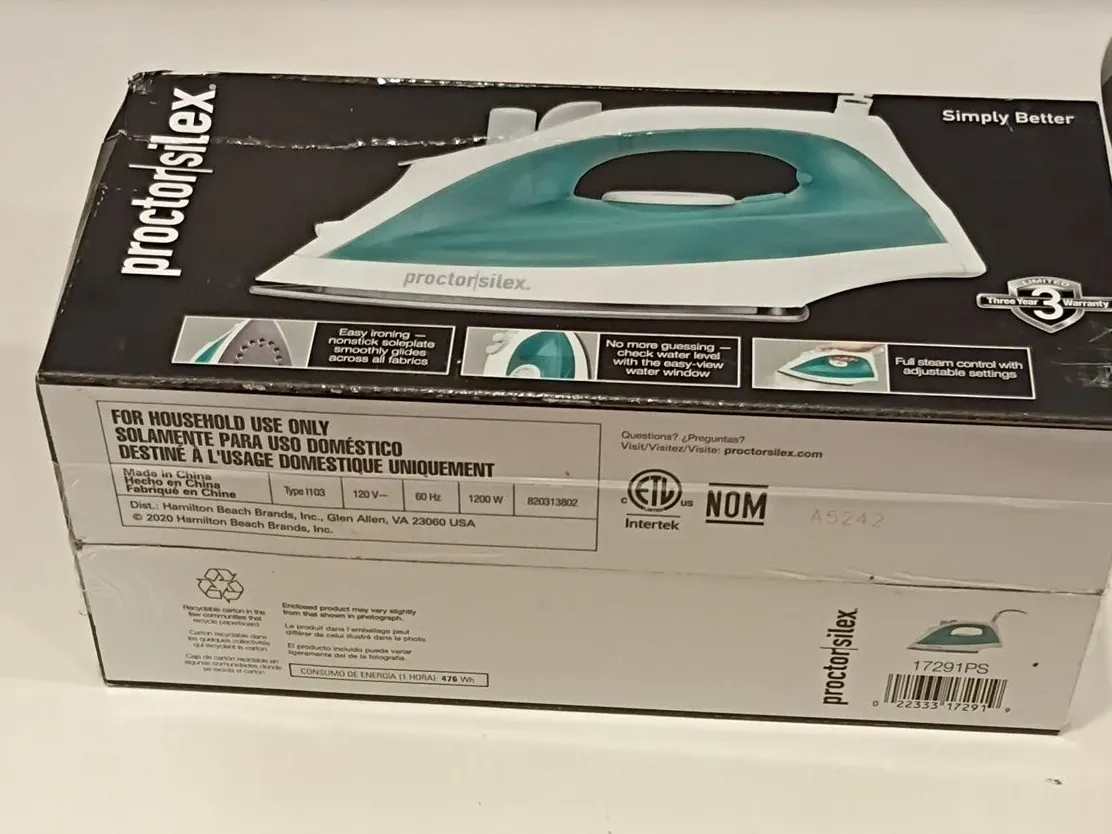 This Proctor Silex iron features a nonstick soleplate for smooth gliding and an easy-view water window. It offers full steam control with adjustable settings. 1200W power.