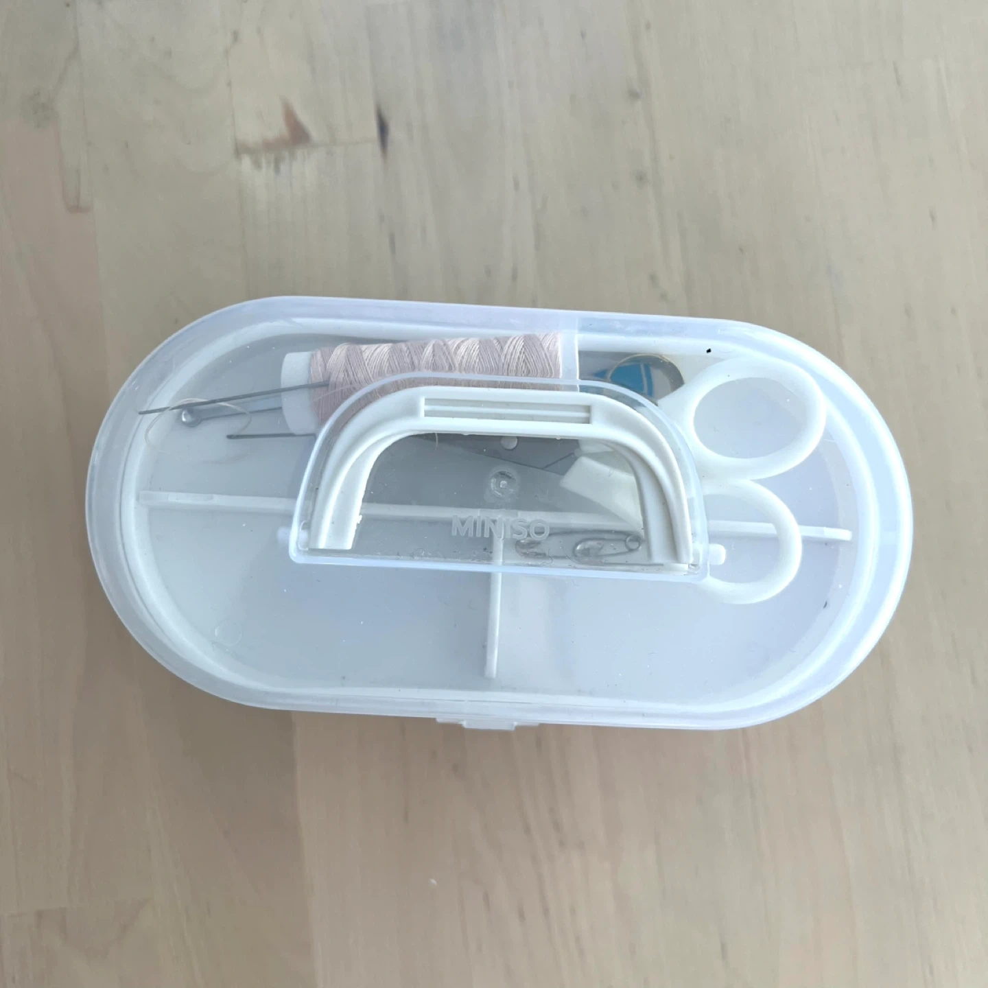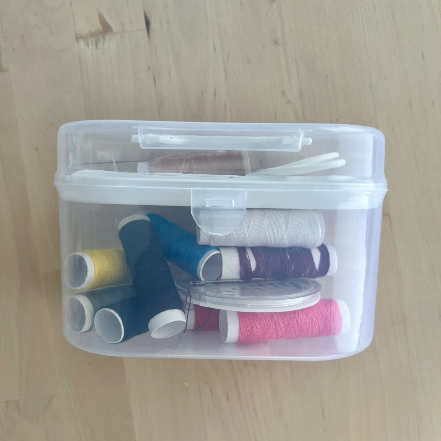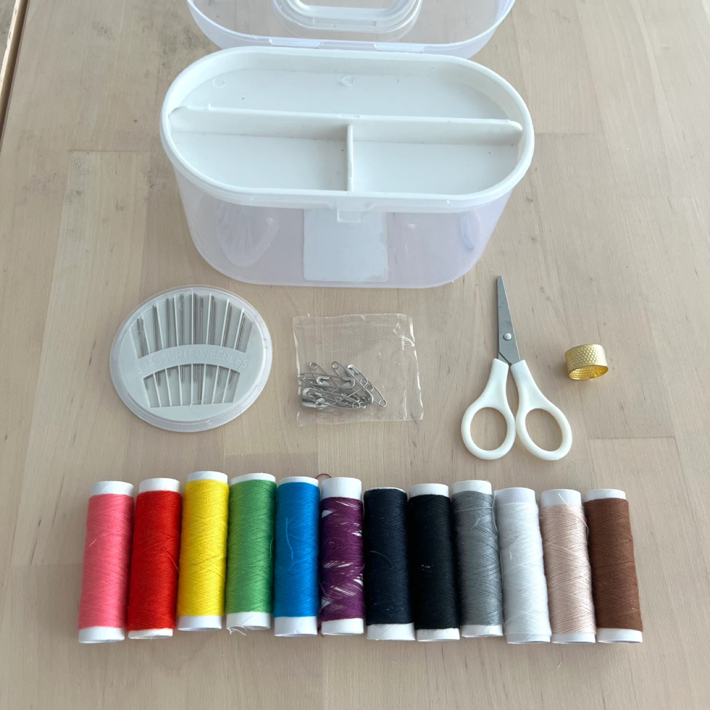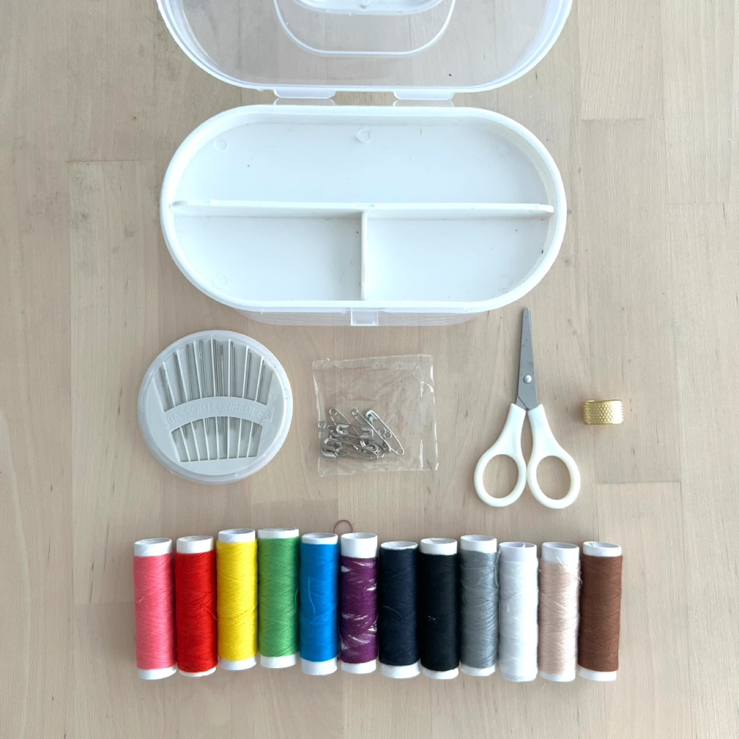 This compact sewing kit includes a variety of thread colours, needles, safety pins, scissors, and a thimble. It all stores neatly in a white plastic case.