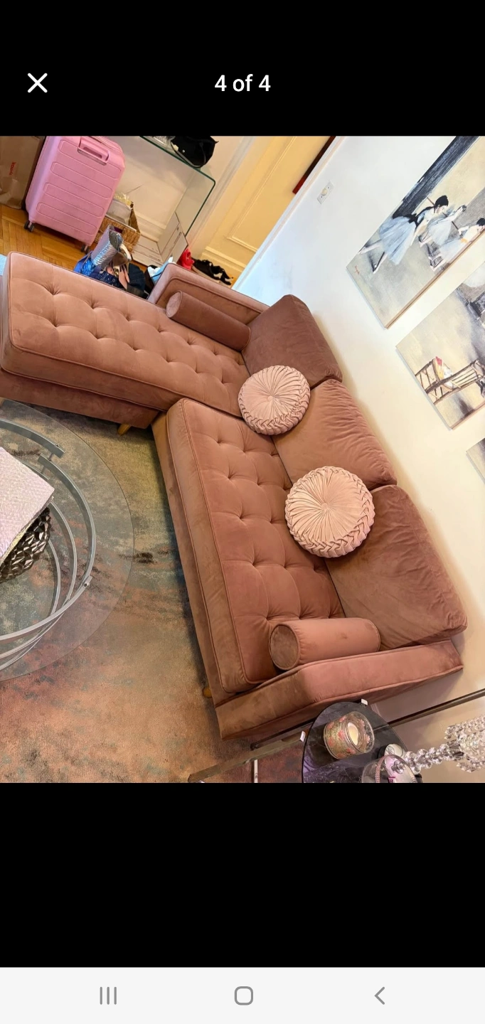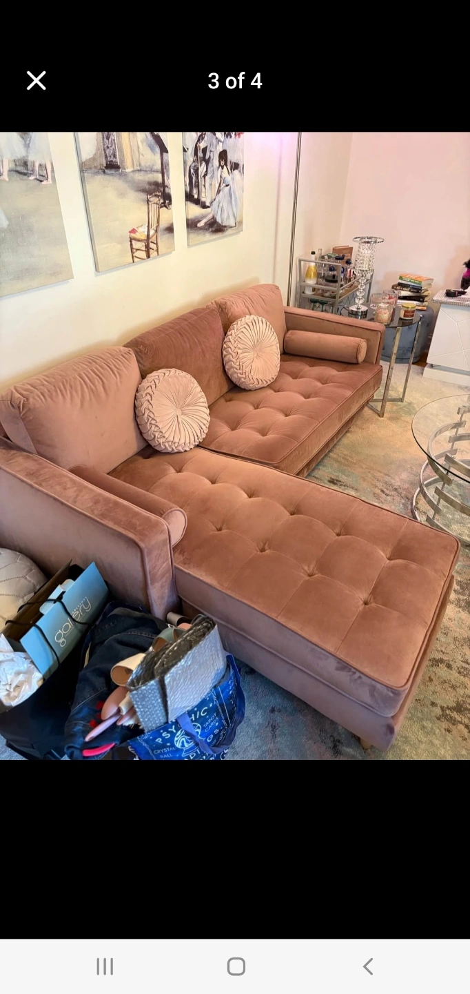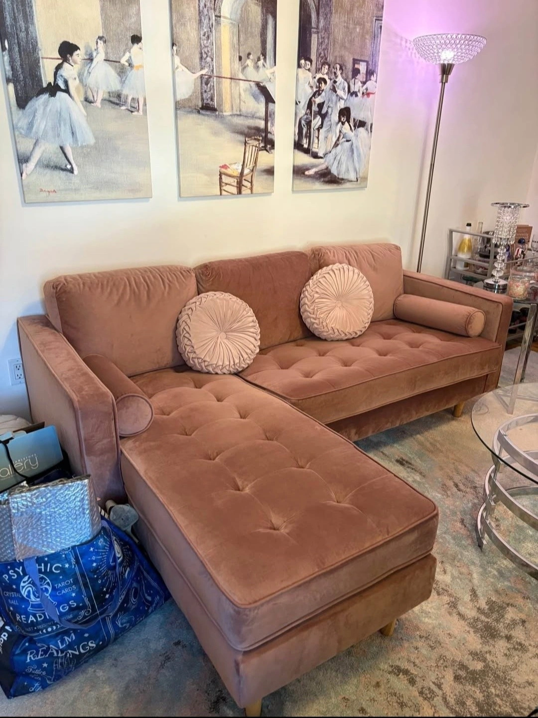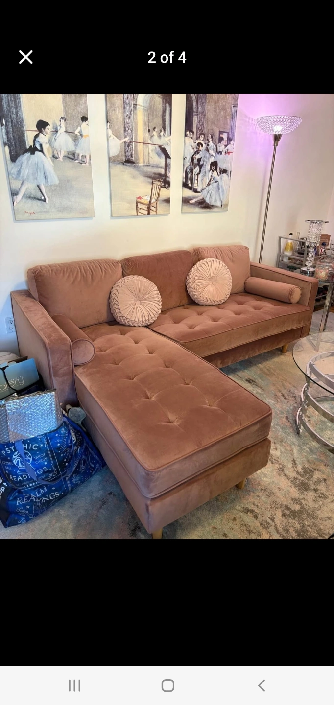 Gorgeous dusty rose velvet sectional. Button tufted. Includes two accent pillows. Modern design. Excellent condition.