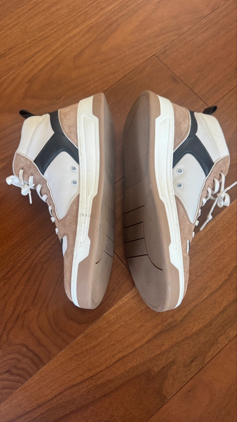 Men's high-top sneakers. Cream, brown, and black color block design. Leather and suede upper. Lace-up closure. Minimal wear.