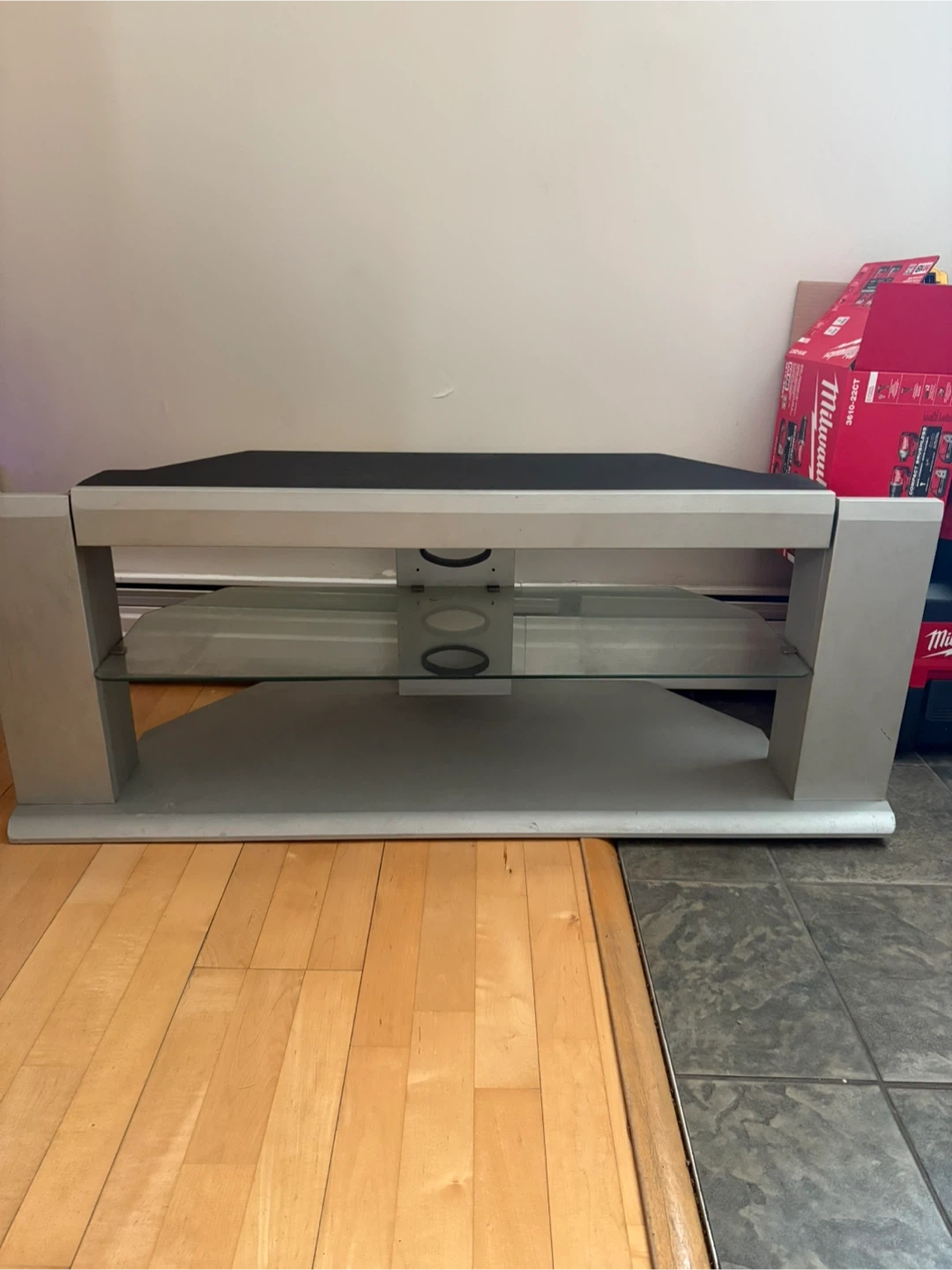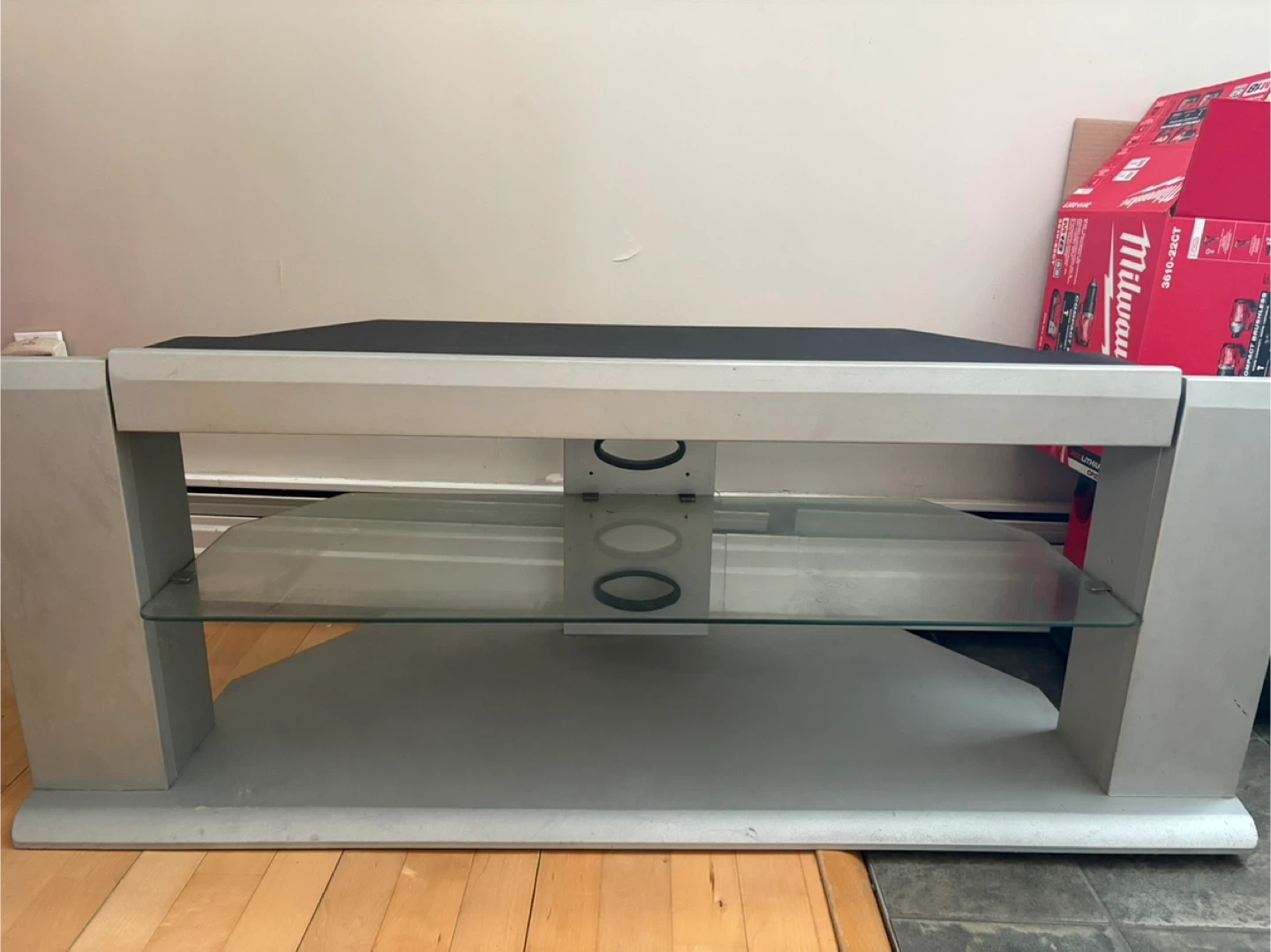This TV stand features a sleek silver finish and two glass shelves for your media components. It's designed to hold your TV and organize electronics. Its open design helps with ventilation.