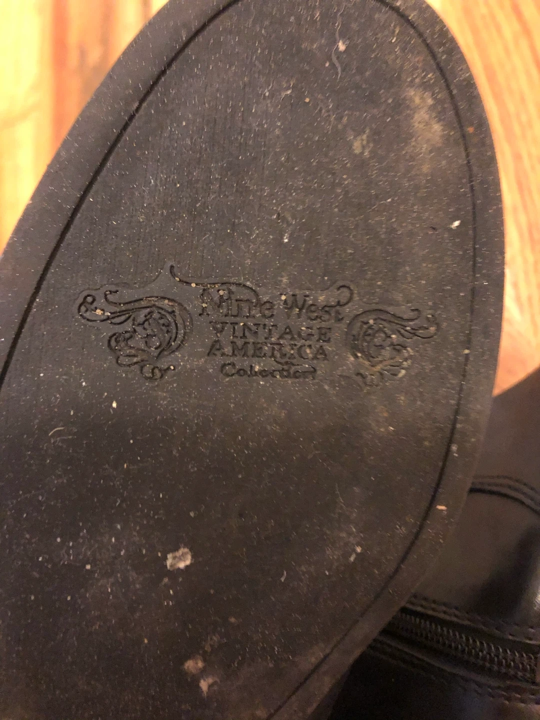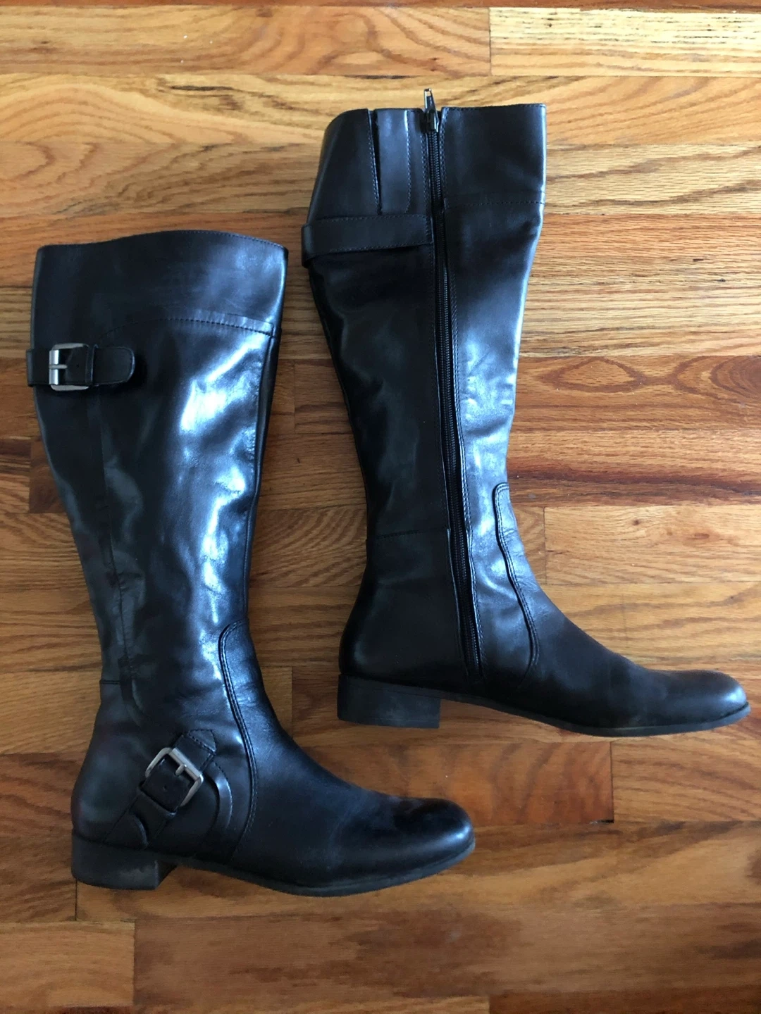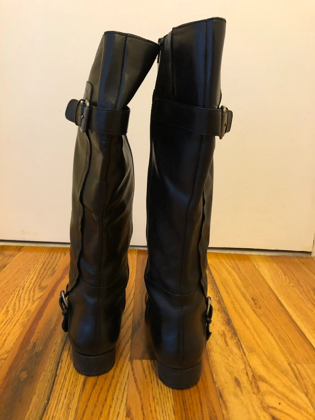 Selling a pair of Nine West knee-high boots in size 8M. They're black leather and feature a zipper and buckle detail. These boots are in great condition and ready for a new owner