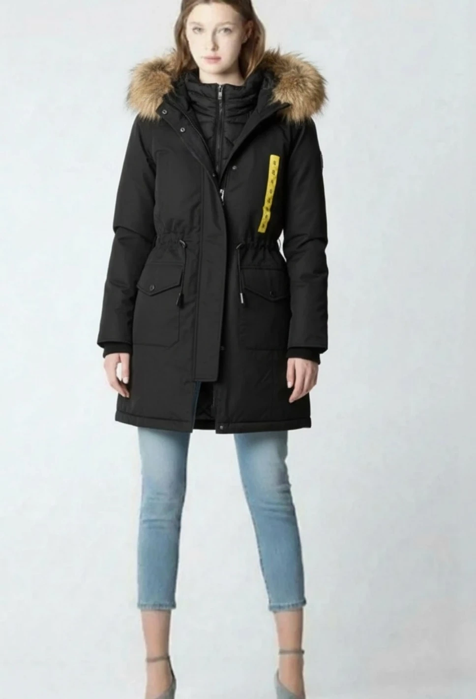 Warm and stylish mid-weight parka. Features polyester fill, front bib vestee, and functional multi pockets. Detachable faux fur trim and adjustable back belt.