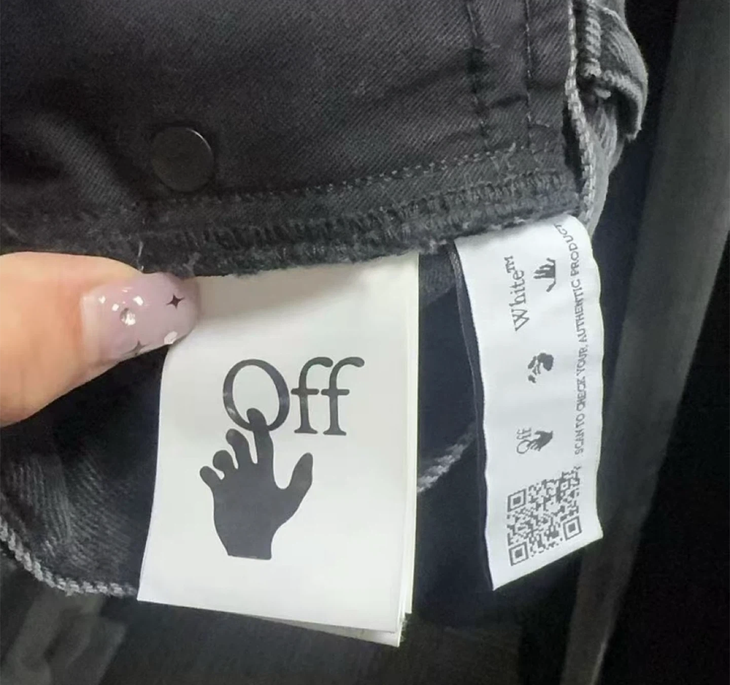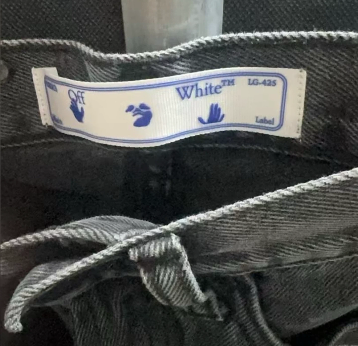 These are OFF-WHITE grey denim shorts. They are a size LG-42S. The shorts feature distressed detailing and "For All" text printed on the leg.