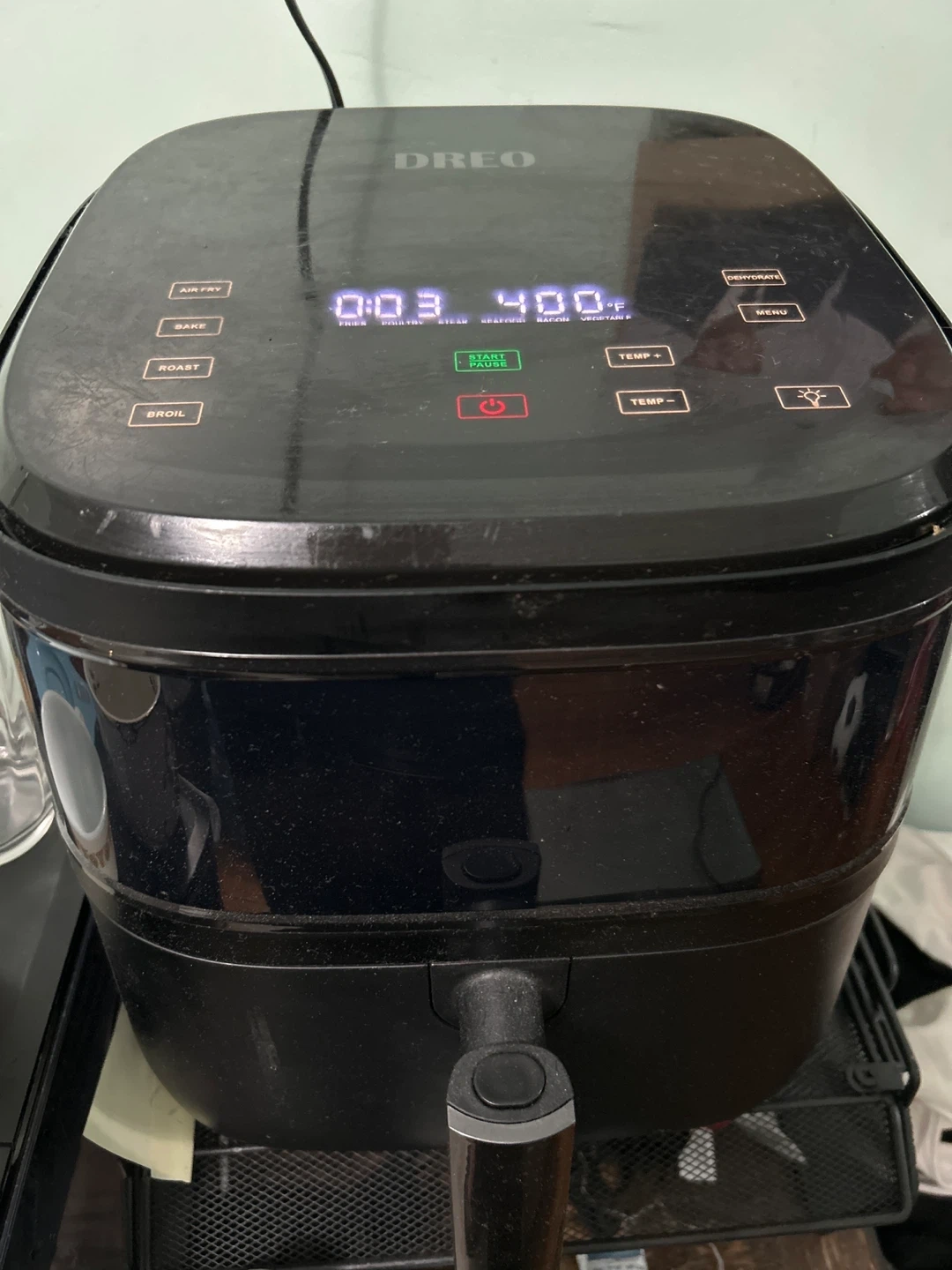 This is a Dreo air fryer. It has multiple cooking functions including air fry, bake, roast, and broil. The digital display shows time and temperature settings up to 400 degrees Fahrenheit. It's perfect for quick meals and snacks!