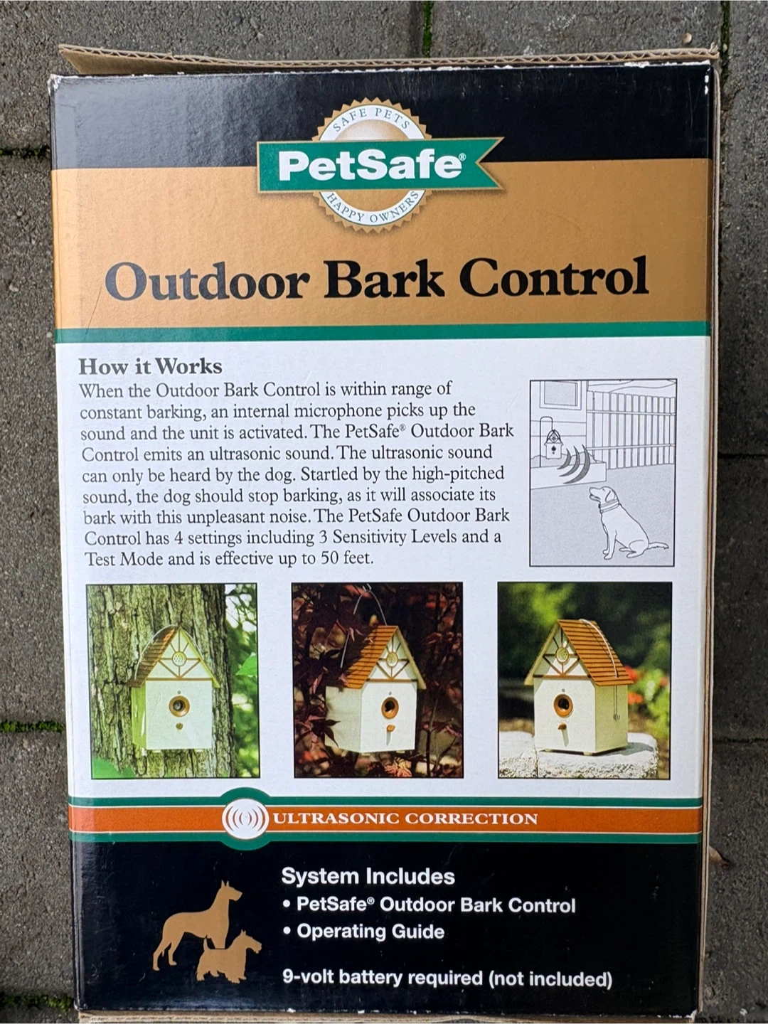 The device detects barking up to 50 feet away and uses ultrasonic sound.