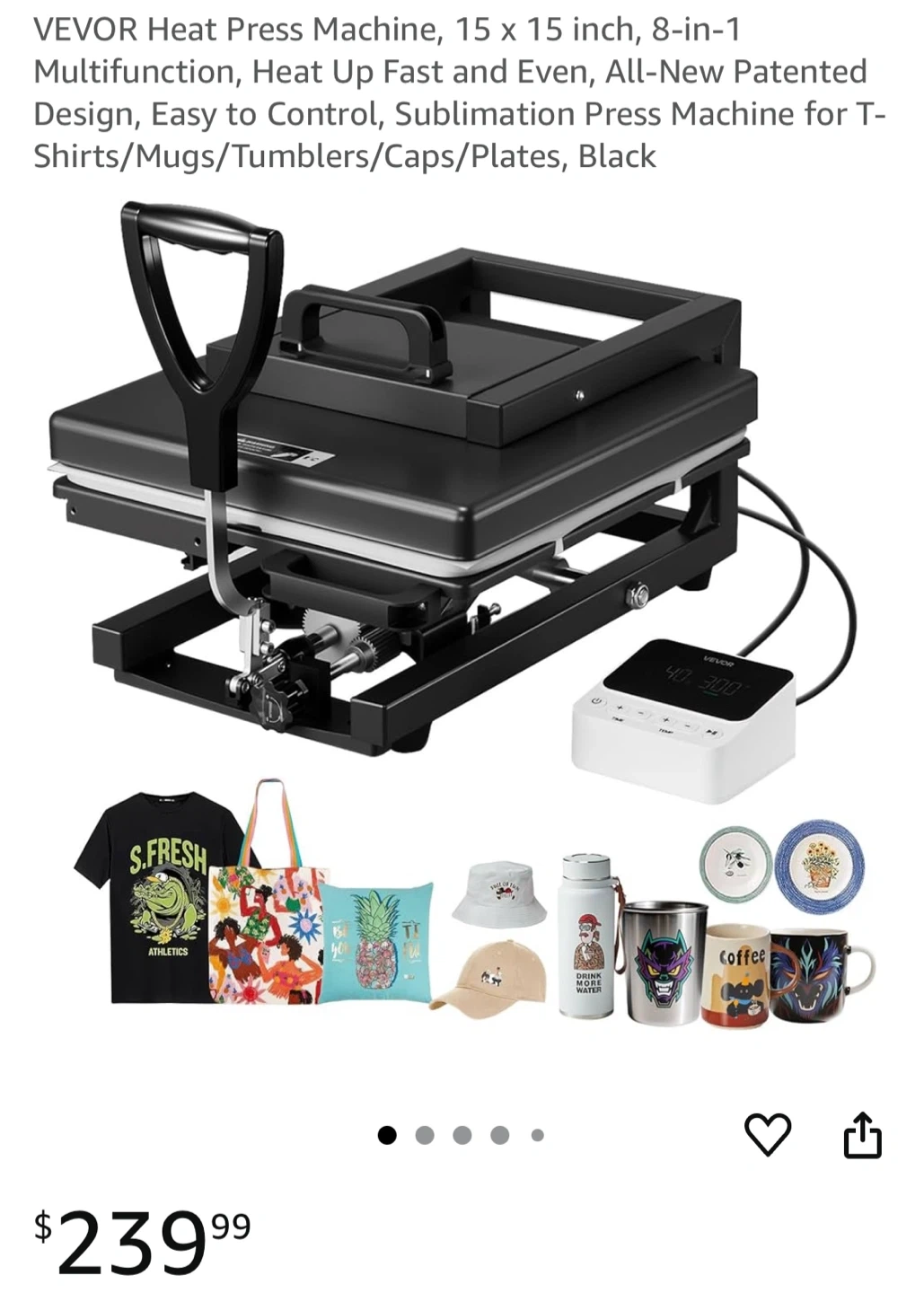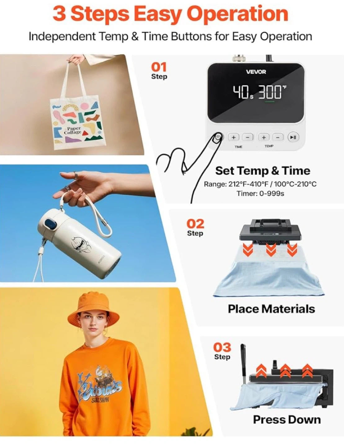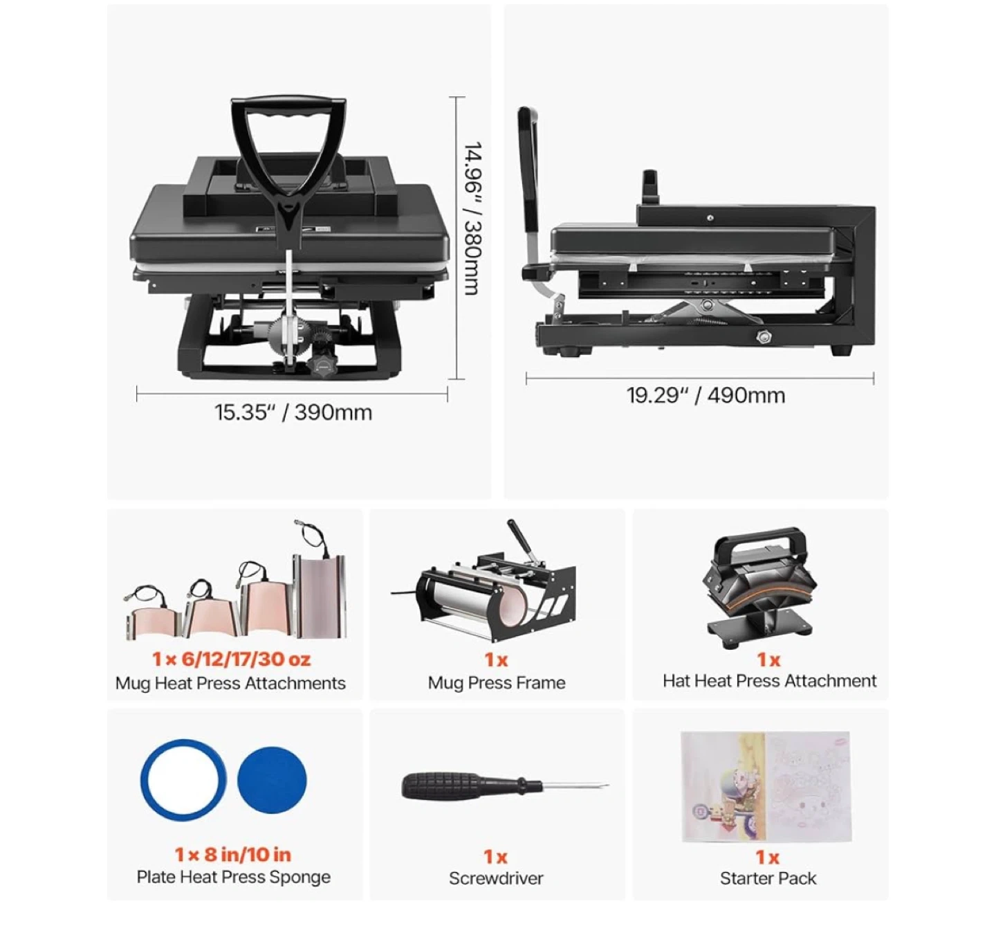 This 5 in 1 digital heat press machine is perfect for T-shirts, mugs, plates, caps, and more! It features independent temperature and time buttons for easy operation. The machine has a fully extendable design with reduced burn risk and an anti-tip design. It also has higher pressure for firmer, more even adhesion and a more stable, peel-proof pattern, ensuring vibrant prints survive countless washes. Included are mug heat press attachments, a mug press frame, a hat heat press attachment, a plate heat press sponge, a screwdriver, and a starter pack