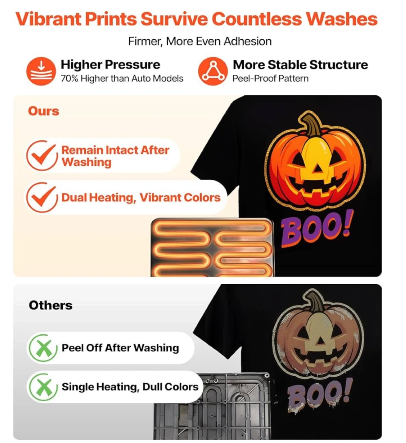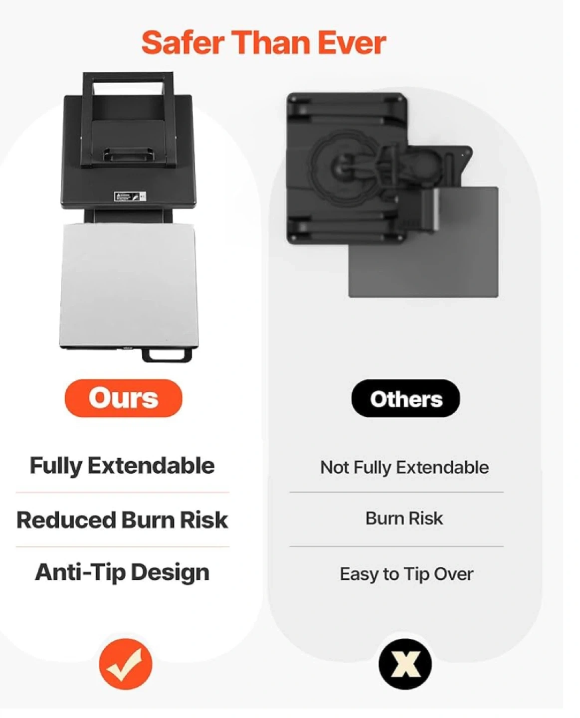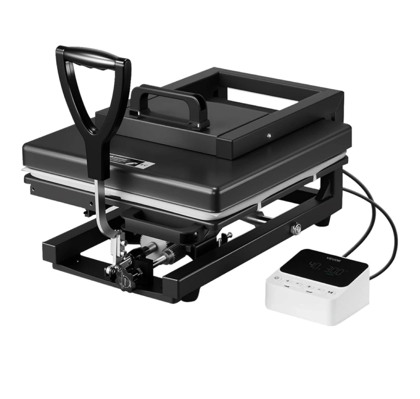 This 5 in 1 digital heat press machine is perfect for T-shirts, mugs, plates, caps, and more! It features independent temperature and time buttons for easy operation. The machine has a fully extendable design with reduced burn risk and an anti-tip design. It also has higher pressure for firmer, more even adhesion and a more stable, peel-proof pattern, ensuring vibrant prints survive countless washes. Included are mug heat press attachments, a mug press frame, a hat heat press attachment, a plate heat press sponge, a screwdriver, and a starter pack
