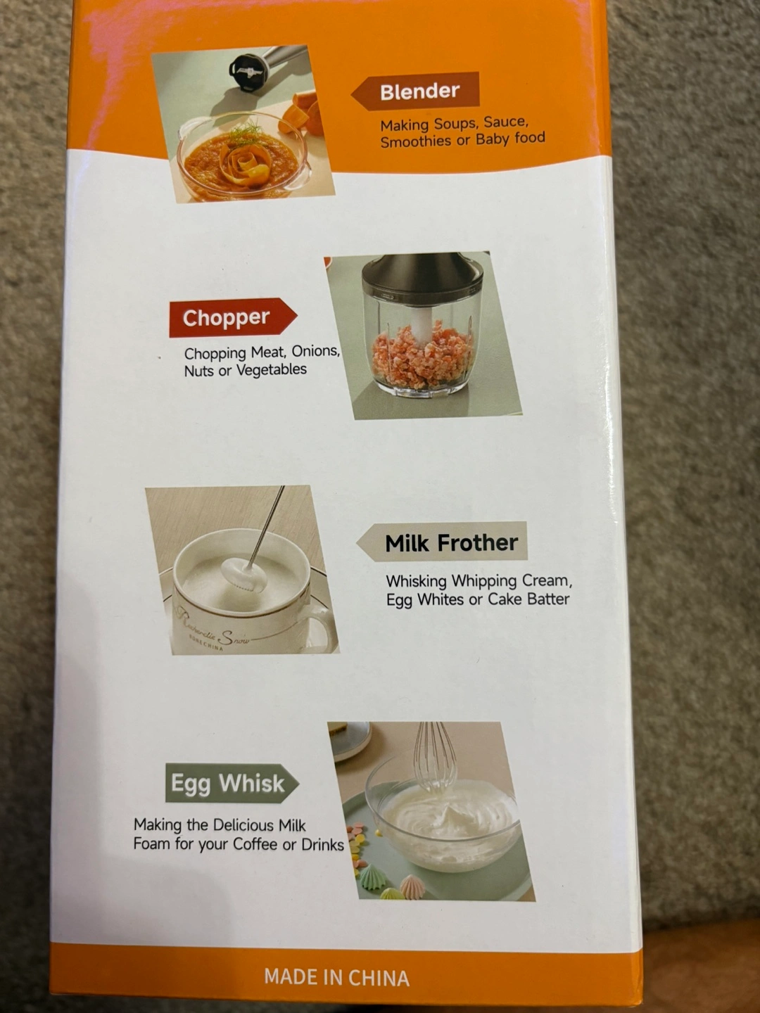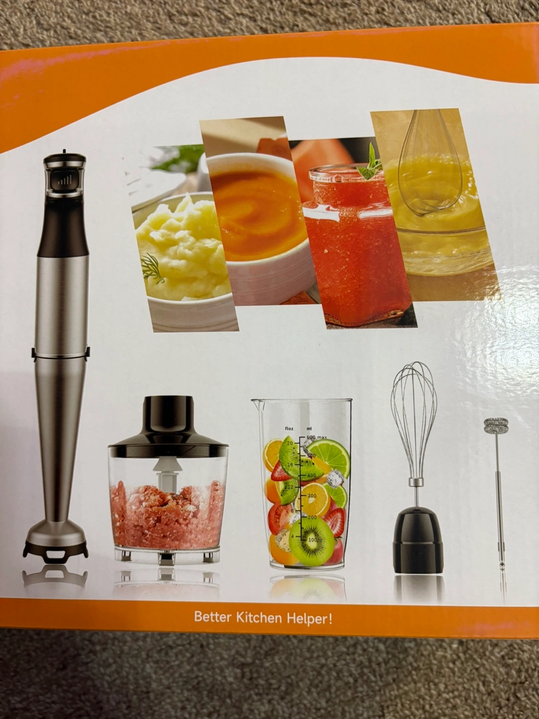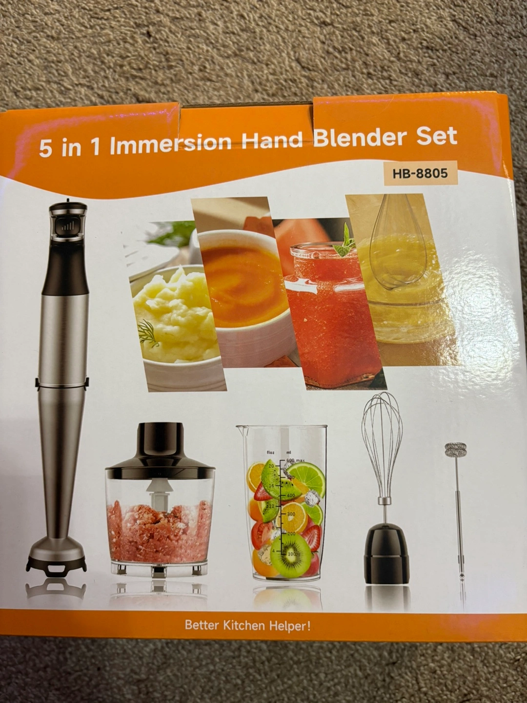 Selling a 5-in-1 Immersion Hand Blender Set! This set is great for making soups, sauces, smoothies, or baby food. It also works as a chopper for meat, onions, nuts, or vegetables. Plus, it can be used as a milk frother for whisking whipping cream, egg whites, or cake batter, and an egg whisk for making delicious milk foam for your coffee or drinks! Better Kitchen Helper!