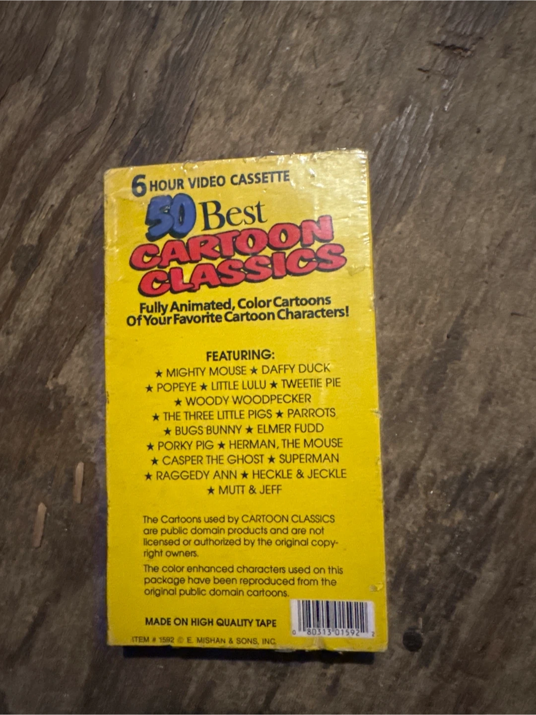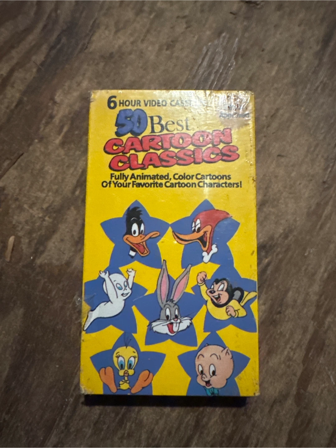 Selling a 6-hour video cassette featuring 50 Best Cartoon Classics! It's packed with fully animated, color cartoons of your favorite cartoon characters. You'll find classics like Mighty Mouse, Daffy Duck, Popeye, Little Lulu, Tweety Pie, Woody Woodpecker, The Three Little Pigs, and many more!
