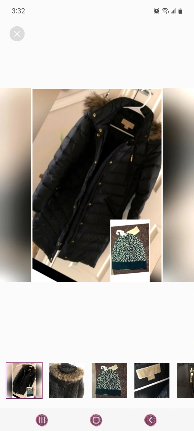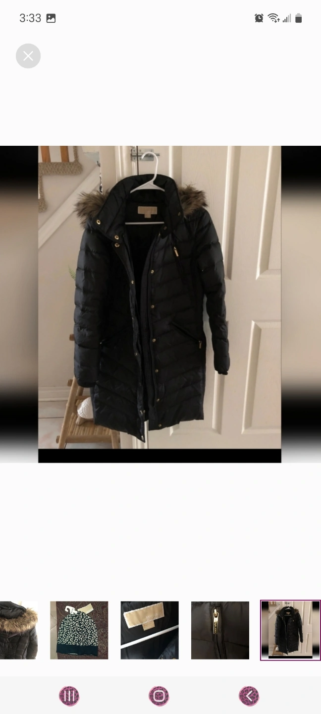 Women's black puffer jacket. Features a faux fur trimmed hood and zipper closure. Long sleeves. Excellent condition. Plus brand new Authentic Michael kors cap