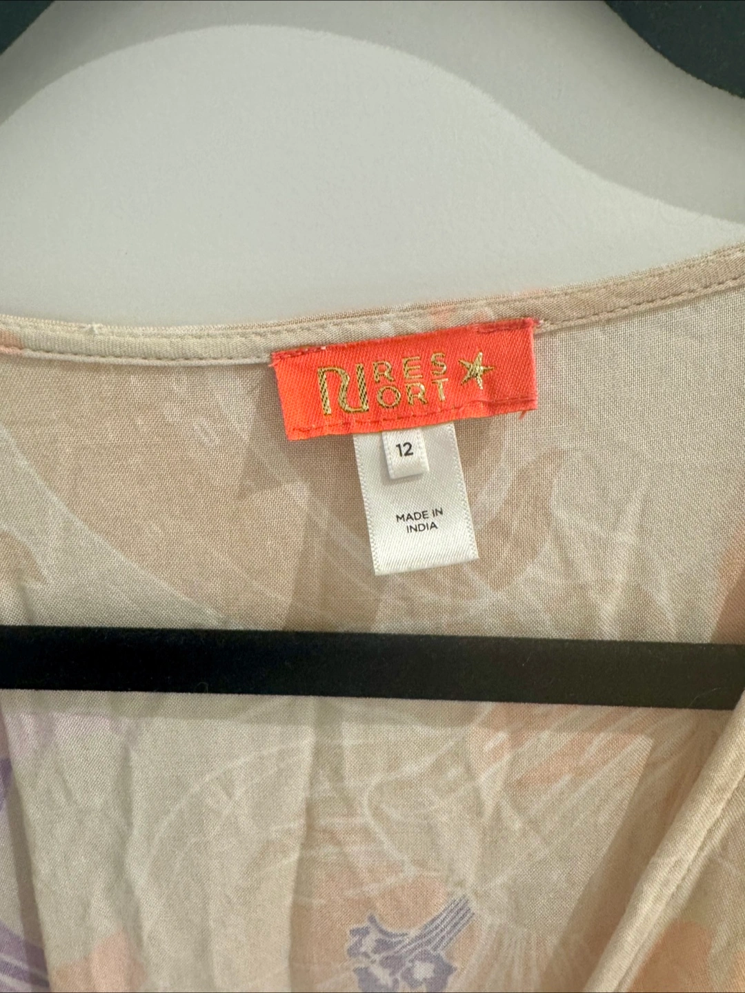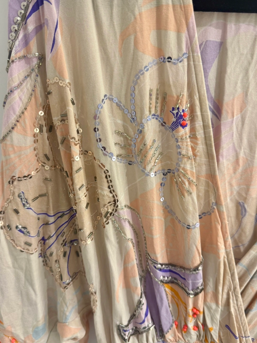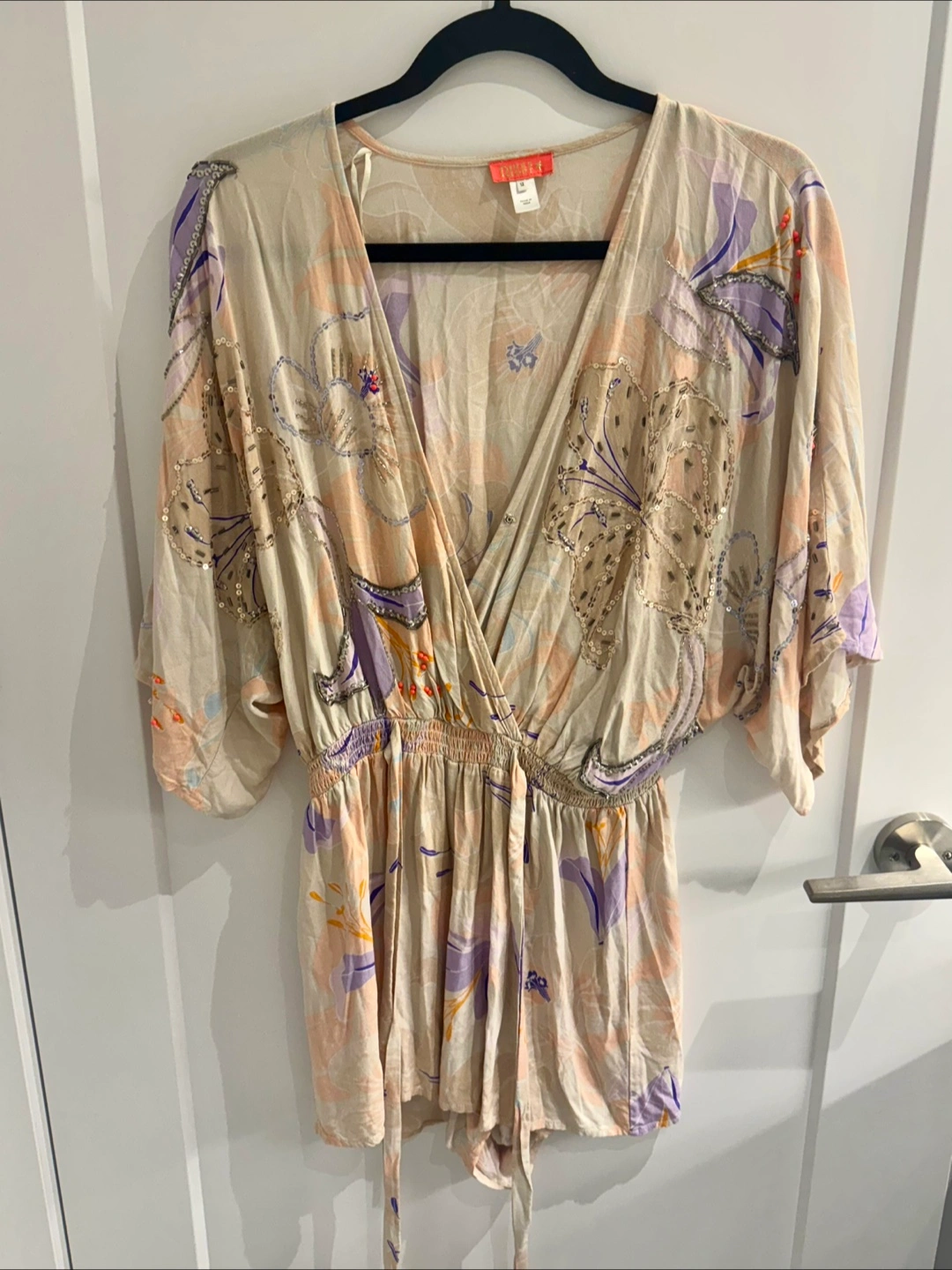 Beautiful beige floral jumpsuit. Features a wrap-style bodice, 3/4 sleeves, and an elasticated waist. Adorned with sparkly beaded floral embellishments. Size 12. Made in India.